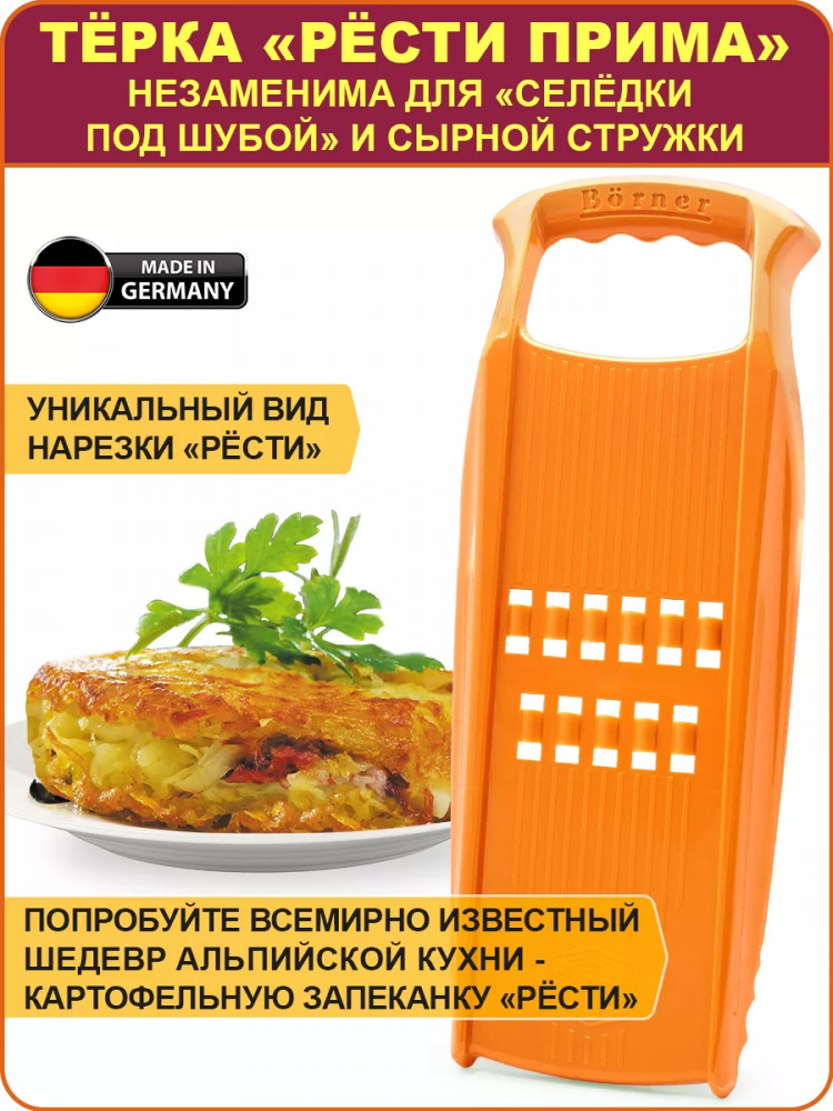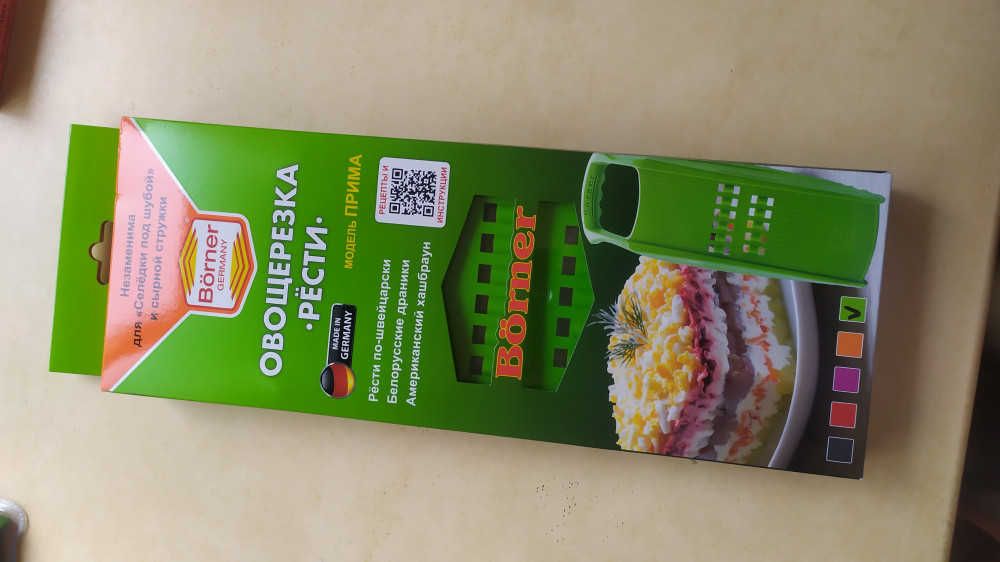 Терка хорошего качества. Цвет рисунку соответствует. К сожалению, пользуюсь ей нечасто, только сыр перетирала для пиццы. Вообще фирма Бёрнер хорошая, собираю все в оранжевом.