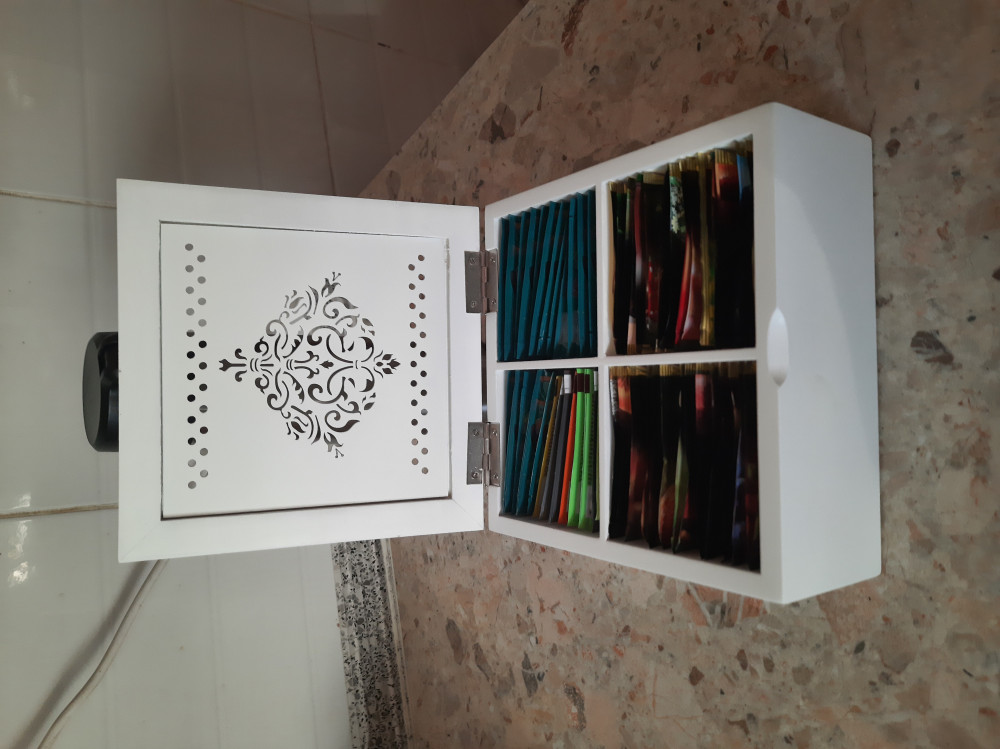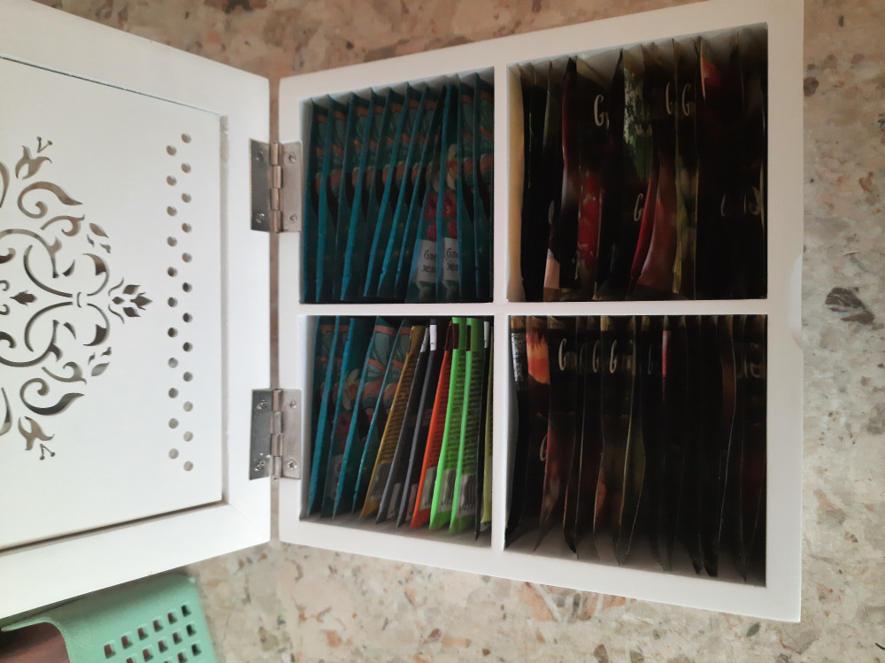 Долго выбирала для чайных пакетов органайзер и эта модель очень понравилась, первое это дерево не нагревается летом при плюсовой температуре, 2 красивый дизайн она как белый лебедь в моих просторах кухни. Устойчивая в низу маленькие ножки и не скользит по столу в виду этих ножек. Количество чайных пакетов 60-70 без усилий в эту красоту спокойно войдёт. Крышка да не много на искосок но она ведь не приваренная намертво. Спасибо Филипп за такую красоту.