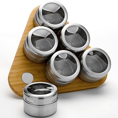 В данный момент этот товар отсутствует в продаже. Возможно, у нас найдется аналогичный или похожий товар здесь. Серия: Бамбук Набор включает в себя баночки для специй, расположенные на бамбуковой магнитной пластине, благодаря чему емкости не потеряются и всегда будут у вас под рукой. Предметы набора выполнены из высококачественной нержавеющей стали. Баночки для специй в наборе имеют одинаковый размер. Плотно закрывающиеся крышки имеют стеклянную вставку, что позволяет без труда найти нужные вам специи. В комплект входит металлический держатель, благодаря которому вы сможете поставить пластину с баночками в нужном для вас месте на кухне.
