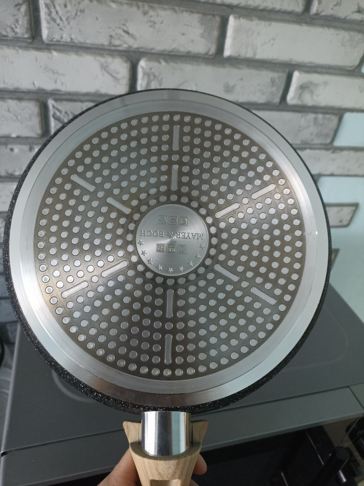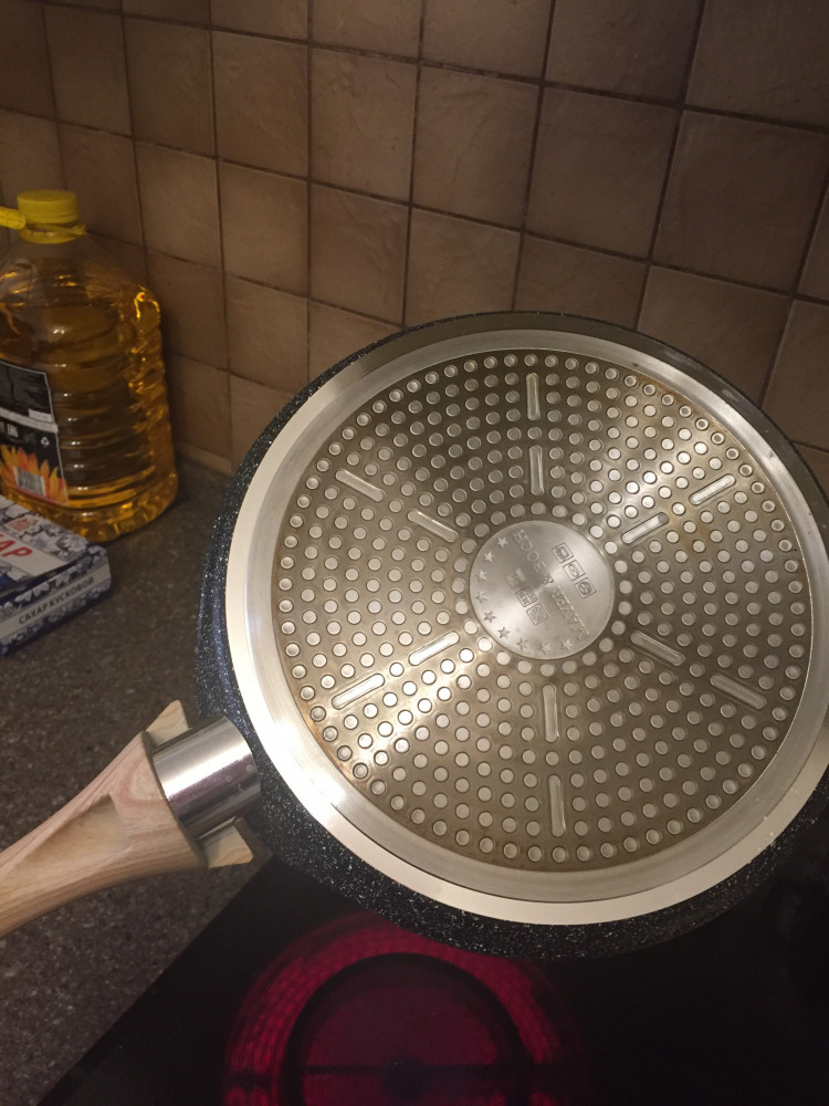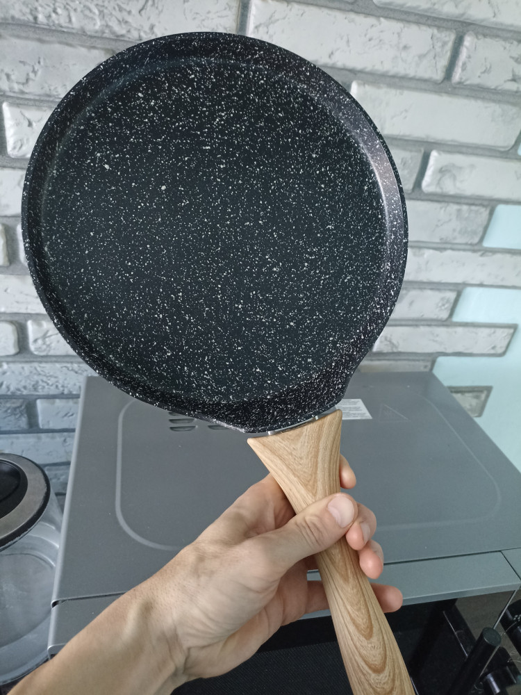 Удобный размер 24 см (диаметр) Хорошее антипригарное покрытие. Блины вообще не пригорают. На сковороду вообще не лью масло. Хорошее дно, быстрый нагрев. Удобная рукоять. Вообще не нагревается.