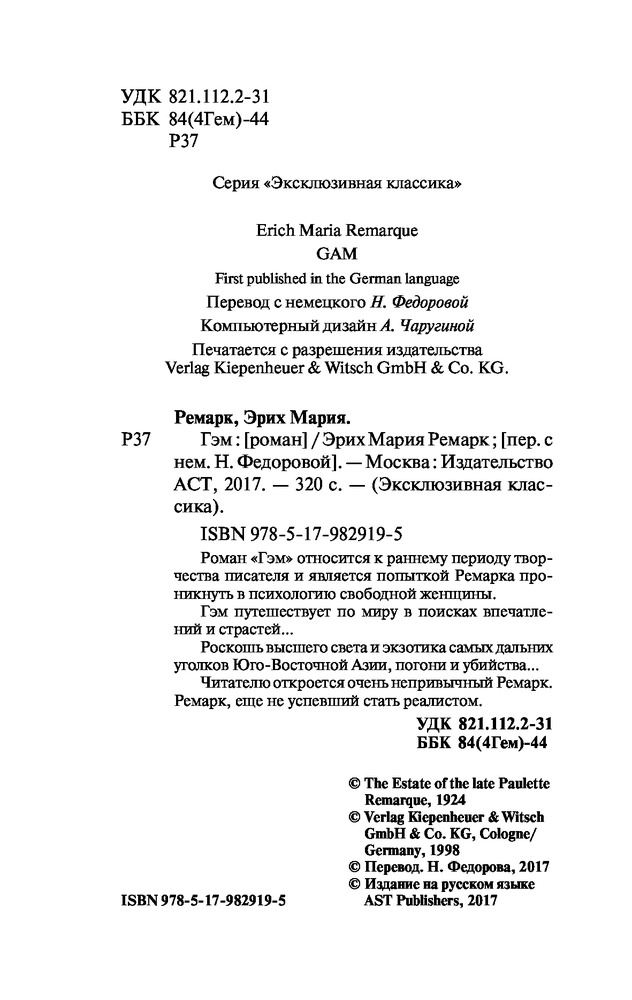 💳 Оплатить за товар можно при получении 🇰🇿 Есть бесплатная доставка по Казахстану от 1 дня 🎁 Копите бонусы с каждой покупки Серия: Эксклюзивная классика ?Роман «Гэм» относится к раннему периоду творчества писателя и является попыткой Ремарка проникнуть в психологию свободной женщины. Гэм путешествует по миру в поисках впечатлений и страстей... Роскошь высшего света и экзотика самых дальних уголков Юго-Восточной Азии, погони и убийства... Читателю откроется очень непривычный Ремарк. Ремарк, еще не успевший стать реалистом. |