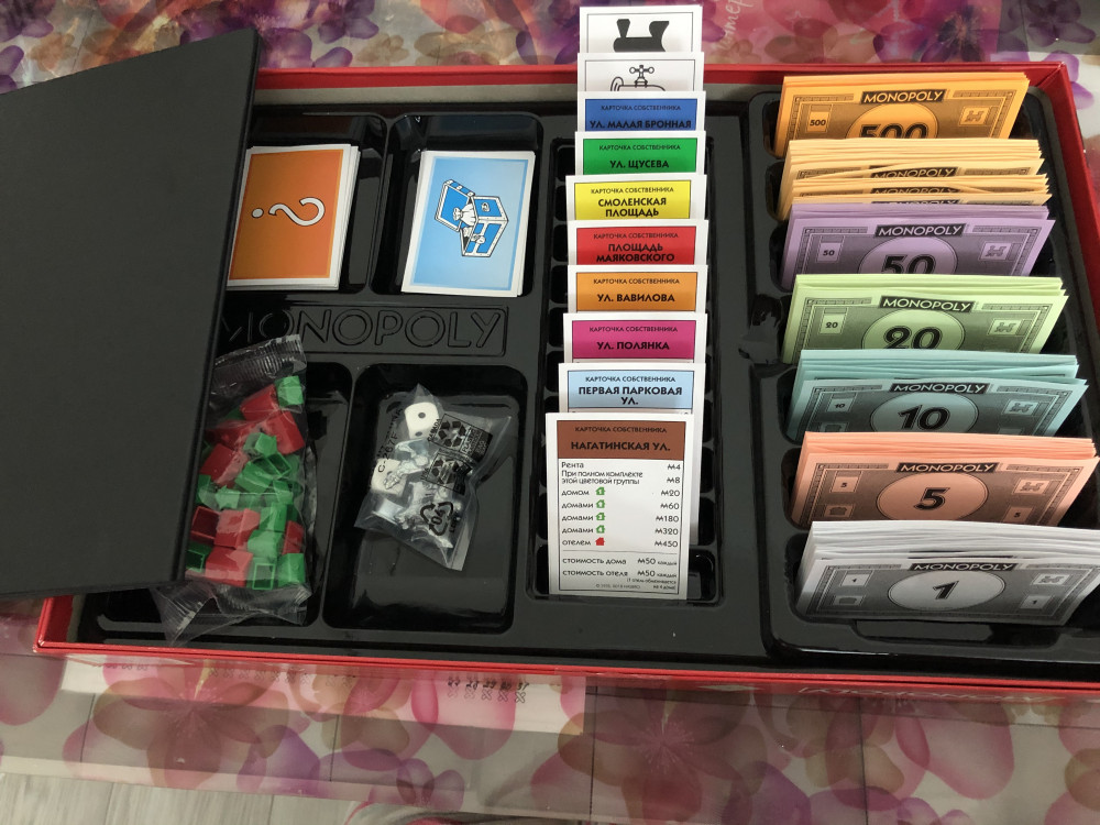 Игра хорошего качества. Поле очень большое, но по смыслу игры карточки на поле не должны лежать из-за этого карточки слишком большие - в ходе игры не знаешь продан или чей это объект. До строительства домиков не реально дойти- нужно все три с одинаковым цветом иметь собственности, что для игроков не всегда реально. Так что эти 32 дома и 12отелей просто лежат без использования.