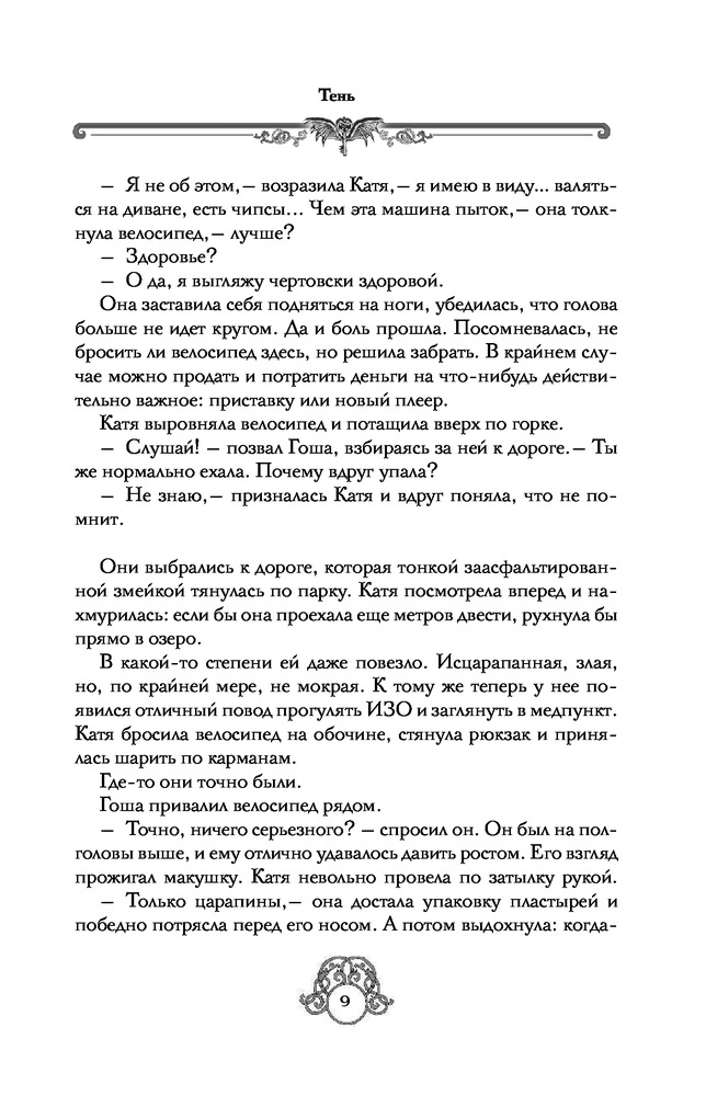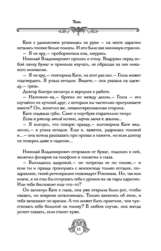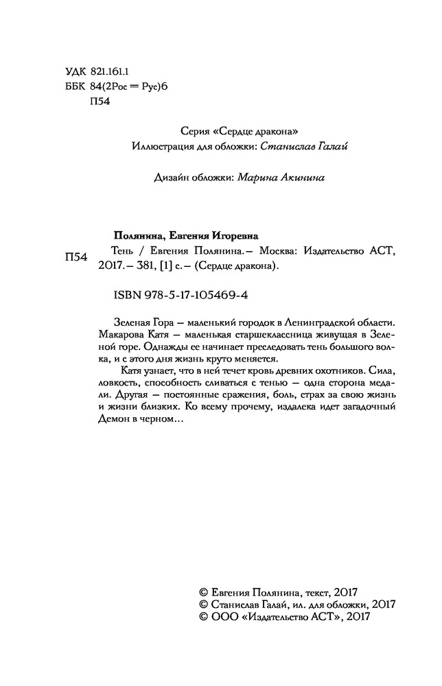 ТеньВ данный момент этот товар отсутствует в продаже. Возможно, у нас найдется аналогичный или похожий товар здесь. Серия: Сердце дракона Зеленая Гора — маленький городок в Ленинградской области. Макарова Катя — маленькая старшеклассница живущая в Зеленой горе. Однажды ее начинает преследовать тень большого волка, и с этого дня жизнь круто меняется. Катя узнает, что в ней течет кровь древних охотников. Сила, ловкость, способность сливаться с тенью — одна сторона медали. Другая — постоянные сражения, боль, страх за свою жизнь и жизни близких. Ко всему прочему, издалека идет загадочный Демон в черном... |
