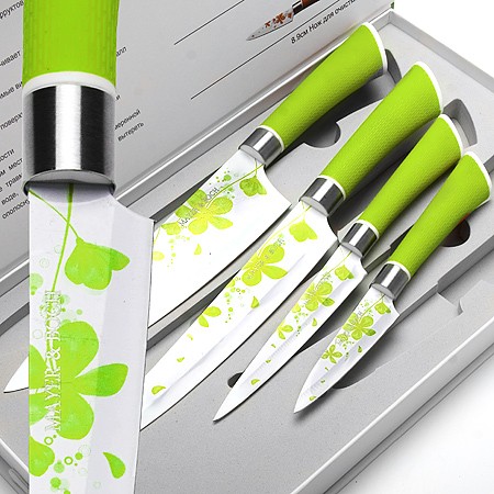 Набор ножей MAYER&BOCH состоит из 4-х универсальных ножей разного размера. Лезвия выполнены из высококачественной нержавеющей стали с покрытием Non-Stick украшенным цветочным узором, имеют износостойкую режущую кромку, благодаря чему ножи дольше остаются острыми, а текстурные эргономичные рукоятки ножей, выполненные из цветного каучука, обеспечивают безопасную работу и комфортное положение в руке. Это прекрасные ножи для ежедневной резки фруктов, овощей и мяса. Изделия имеют гладкую, легко очищаемую поверхность. Оригинальный дизайн набора и качество исполнения не оставят Вас равнодушными. Набор MAYER&BOCH станет великолепным подарком и отлично украсит интерьер Вашей кухни. Готовьте с удовольствием!