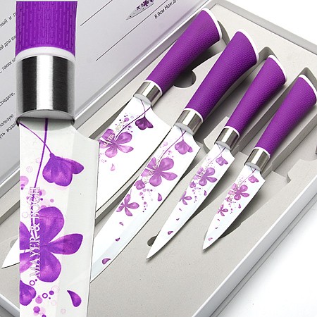 Набор ножей MAYER&BOCH состоит из 4-х универсальных ножей разного размера. Лезвия выполнены из высококачественной нержавеющей стали с покрытием Non-Stick украшенным цветочным узором, имеют износостойкую режущую кромку, благодаря чему ножи дольше остаются острыми, а текстурные эргономичные рукоятки ножей, выполненные из цветного каучука, обеспечивают безопасную работу и комфортное положение в руке. Это прекрасные ножи для ежедневной резки фруктов, овощей и мяса. Изделия имеют гладкую, легко очищаемую поверхность. Оригинальный дизайн набора и качество исполнения не оставят Вас равнодушными. Набор MAYER&BOCH станет великолепным подарком и отлично украсит интерьер Вашей кухни. Готовьте с удовольствием!
