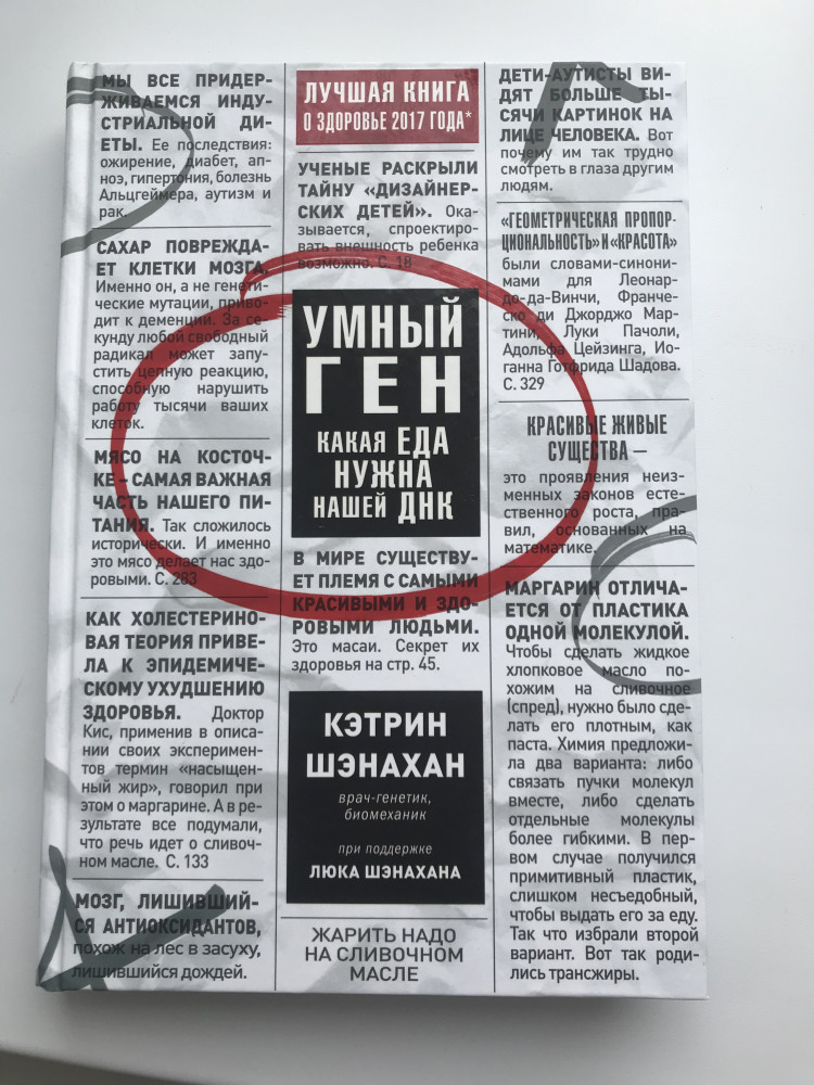 Очень Умная Книга, которая полностью поменяла мое отношение к еде на 360 градусов! Всем рекомендую! Умный ген - какая еда нужна нашей ДНК является самым мощным из доступных вам инструментов для оптимизации Здоровья. Эта книга, которая даёт вам контроль над судьбой вашего здоровья. Автор книги как врач писала эту книгу прежде всего тем, кто готов вернуться на правильную дорогу в жизни, потому что, чтобы жить так, как захочется, так , как вы себе представляли, для начала нужно вернуть себе контроль над вашим здоровьем. Каждая глава до отказа заполнена научными откровениями, которым вы можете воспользоваться, чтобы предпринять позитивные действия направленные на улучшение здоровья. Какие блюда раскроют ваш генетический потенциал, а также о диете который покончит со всеми диетами и многое полезное и вкусное вы узнаете в этой книге.