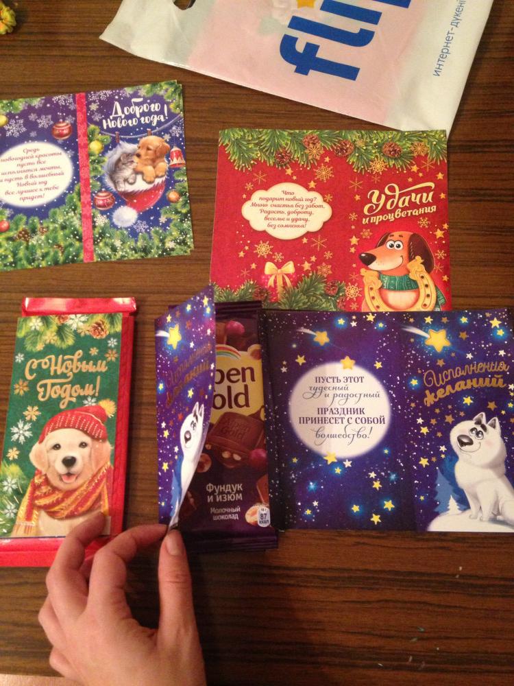 Красивая обертка, брала, как корпоративный подарок на новый год. Влезают не все шоколадки. Еле обернула Казахстанский Рахат и шоколад Милка. На большие, не влезет, в этом минус. Коллегам очень понравилось, сказали, что оригинально. Очень хорошие пожелания напечатаны. Так и шоколадку дарить не стыдно :) Склеивала тонким скотчем.