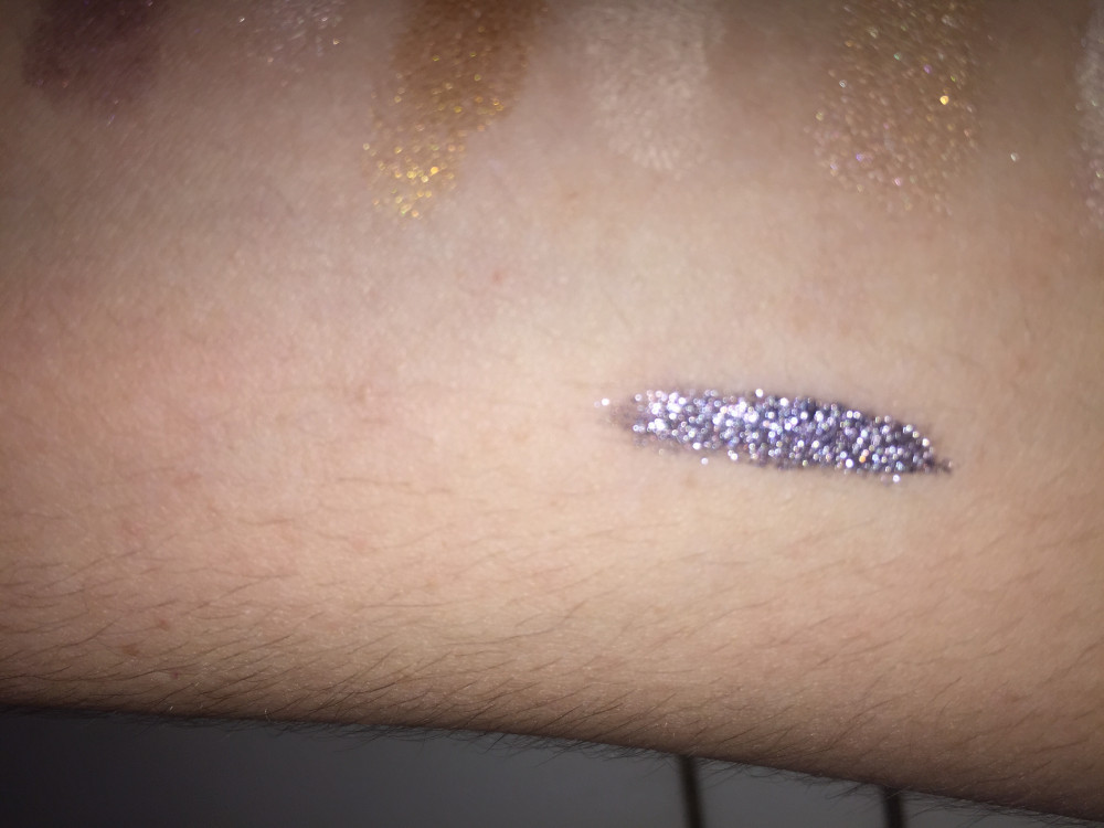 Оттенок 2 с крупными блёстками, но ложится хорошо, и цвет красивый, соответствует картинке. На глазах тени держатся хорошо, никуда не плывут и не забиваются, с 8 до 16 ч продержалась в первозданном виде, потом тускнеют что ли, но в целом нормально.