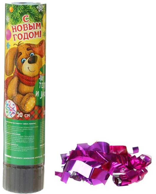 Пружинная хлопушка стреляет конфетти и фольгой. Приводится в действие при повороте специально обозначенной части.