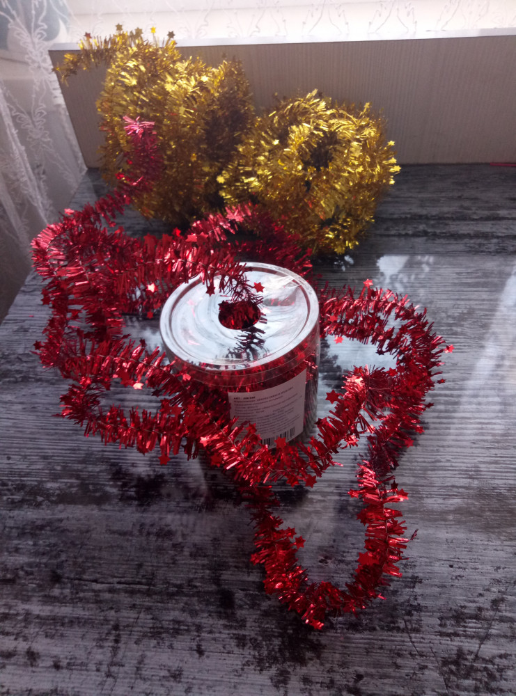 Очень яркая мишура, понравилась, брала красную и золотую. Обе в коробочках, удобно будет хранить после праздников. На елку трудновато наматывать, она на проволоке, не лежит, а стоит, но все равно, красиво.