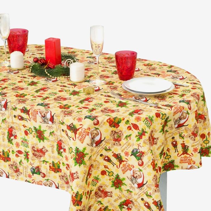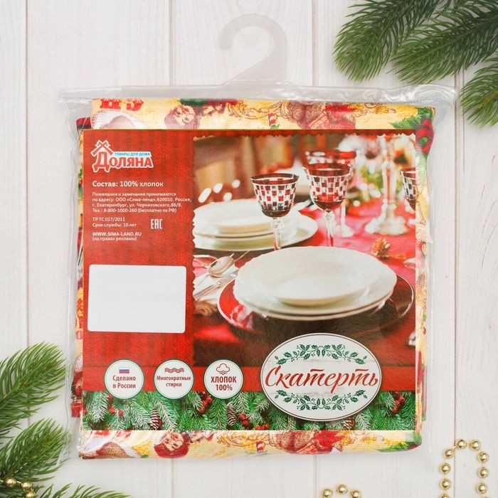 Скатерть украсит праздничный интерьер. Изделия с эксклюзивным принтом сшито из хлопкового полотна. Этот материал имеет плотную и упругую структуру, обладает высокой прочностью и на ура справляется с первостепенными задачами: