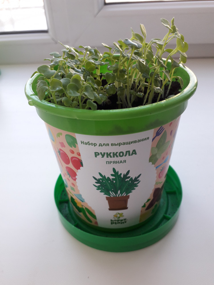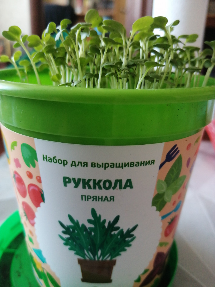 Удобный набор для выращивания. В наборе есть горшок, грунт, дренаж и семена. Первые росточки проклюнулись буквально через два-три дня, растут быстро, неприхотливы. Горшочек стоит у окна, выходящего на север, свет попадает рассеянный, поливаю по необходимости, т.е. в зависимости от сухости почвы. На вкус руккола немного острая, но вкусная и ароматная.