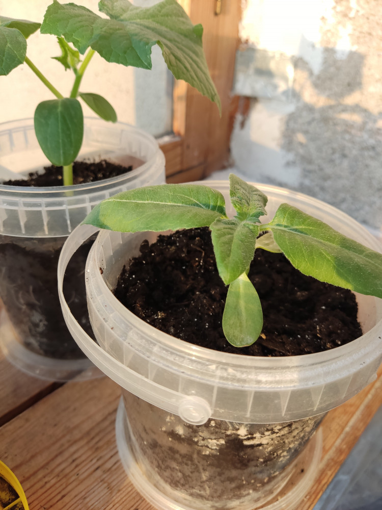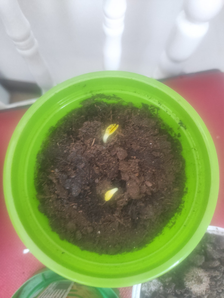 Результат через 25 дней посадки. Взошли все 4 семечка, жду подсолнухи😊🌻🌻🌻🌻