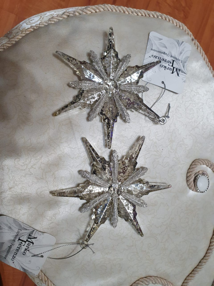 Очень красивые снежинки. Прозрачно - серебристые. Материал акрил. Внутри снежинки мелкие блёстки. В диаметре сантиметров 10 - 11. В общем, действительно красивые, выглядят волшебно. Спасибо большое, Флип, за прекрасные товары.