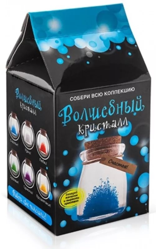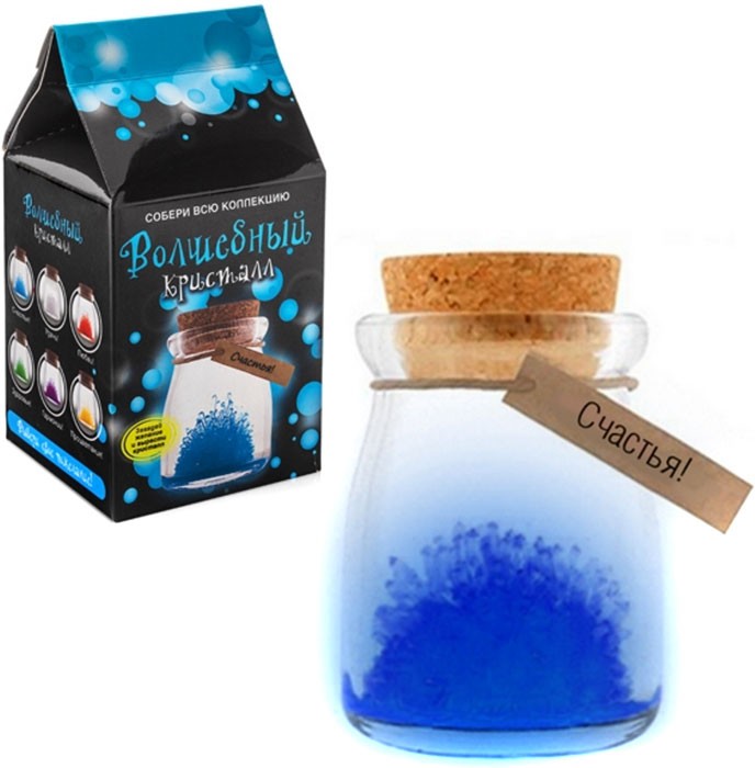 В каждом наборе: красивая баночка, в которой удобно следить за выращиванием кристаллов, волшебный кристаллический порошок, кристаллическая таблетка, палочка для перемешивания, пробка, веревочка, карточка с пожеланием и инструкция.