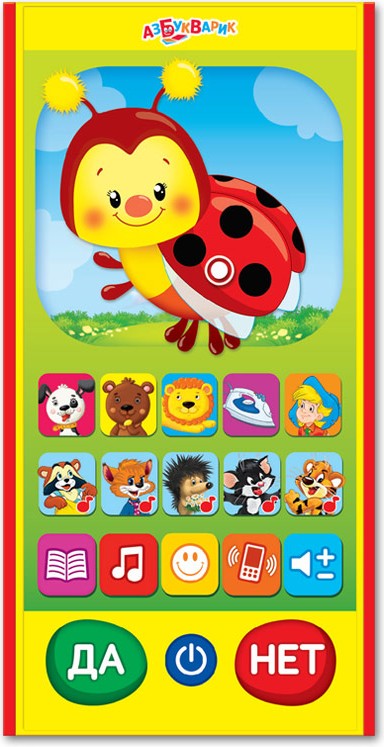 Азбукварик Смартфончик «Божья коровка Знайка»В данный момент этот товар отсутствует в продаже. Возможно, у нас найдется аналогичный или похожий товар здесь. Серия: Смартфончик В этом смартфончике есть все, что любят малыши: и увлекательная викторина, и мультсказки, и любимые песенки! Божья коровка Знайка говорит и поет — стоит только к ней прикоснуться! Выбери одну из 5 игровых тем: питомцы, лес, зоопарк, помощники и мультики. В каждом теме — 10 увлекательных вопросов, попробуй ответить на все! |