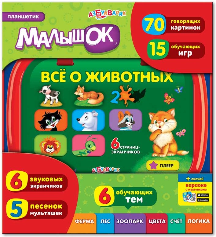 Азбукварик Планшет «Всё о животных»В данный момент этот товар отсутствует в продаже. Возможно, у нас найдется аналогичный или похожий товар здесь. Планшетик «Малышок» — это новое поколение обучающих книг-игрушек! Перелистывая странички-экранчики, ребенок познакомится с животными, цифрами и цветами, поиграет в обучающие игры, отгадает веселые загадки! |