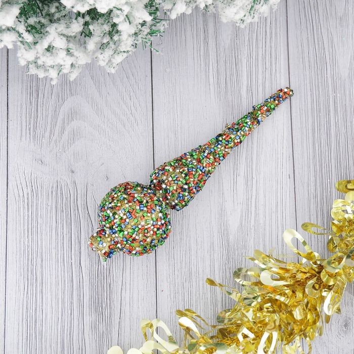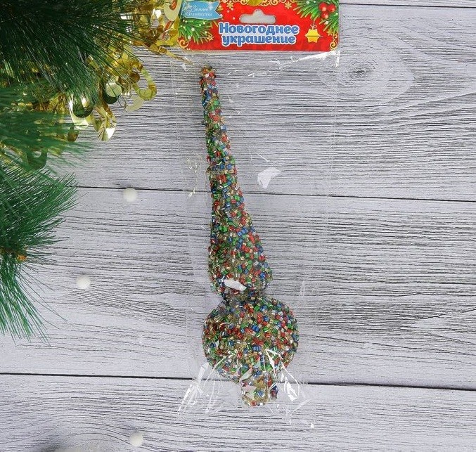 В моем случае игрушка лучше выглядит на картинке, чем в реальности. Весь стеклярус посыпался, как только вынула ее из упаковки. Отверстие , на которое ее "сажать" очень узкое, для елочки с тонкими веточками. Попробую ее "прокачать", переклеить стеклярус и расширить посадочное место. Вообще игрушка яркая, размер соответствует, но клей подкачал.
