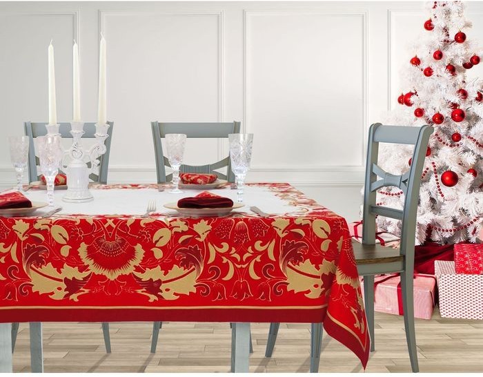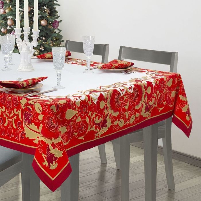 Столовый набор украсит праздничный интерьер. Изделия с эксклюзивным принтом сшиты из хлопкового полотна. Этот материал имеет плотную и упругую структуру, обладает высокой прочностью и на ура справляется с первостепенными задачами: