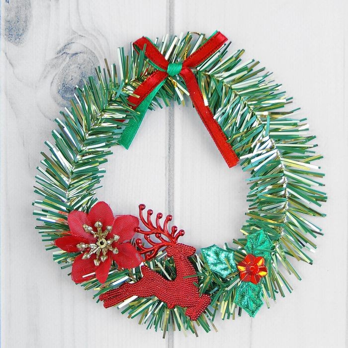 Венок соответствует описанию и картинке, немного не хватило пушистого объема, поэтому не стали вешать на двери. Дети сразу повесили на елке.