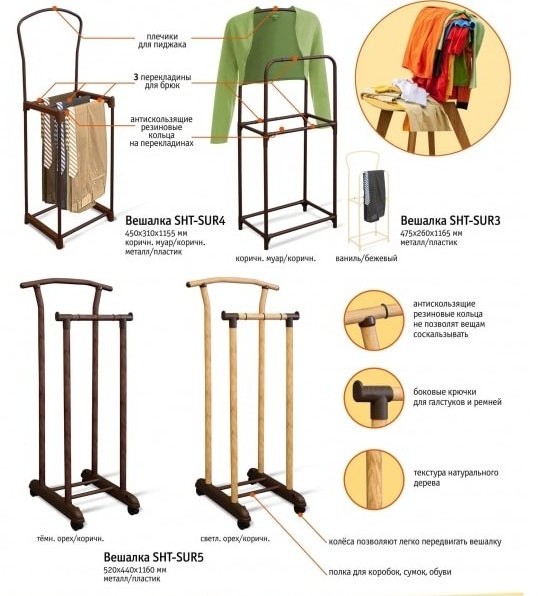 Sheffilton Вешалка костюмнаяВ данный момент этот товар отсутствует в продаже. Возможно, у нас найдется аналогичный или похожий товар здесь. Костюм на видном месте и вешалка, не занимающая много места. Текстура натурального дерева делает её универсальной для любой комнаты, она будет хорошо смотреться как в гостиной, прихожей, так и рабочем кабинете или приемной. Предусмотрены перекладина для брюк и штанга для пиджака, боковые крючки и полка. Боковые крючки можно использовать для галстуков, ремней. На полке можно хранить обувь, коробки, сумки, рюкзаки. Резиновые кольца на штанге и перекладинах не позволят вещам соскальзывать. Благодаря колесам, вешалку можно легко перемещать по дому. |