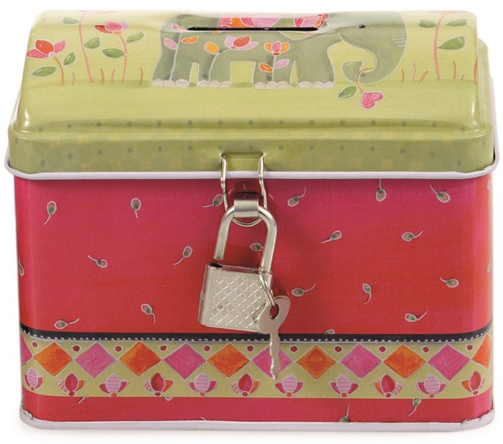 Металлическая копилка выполнена в красном цвете с зеленой крышкой. На крышке красивый рисунок индийского слона и прорезь для монет. Копилка закрывается на замочек. Дети будут увлеченно заполнять копилку монетами, а также смогут прятать в ней свои секретики.
