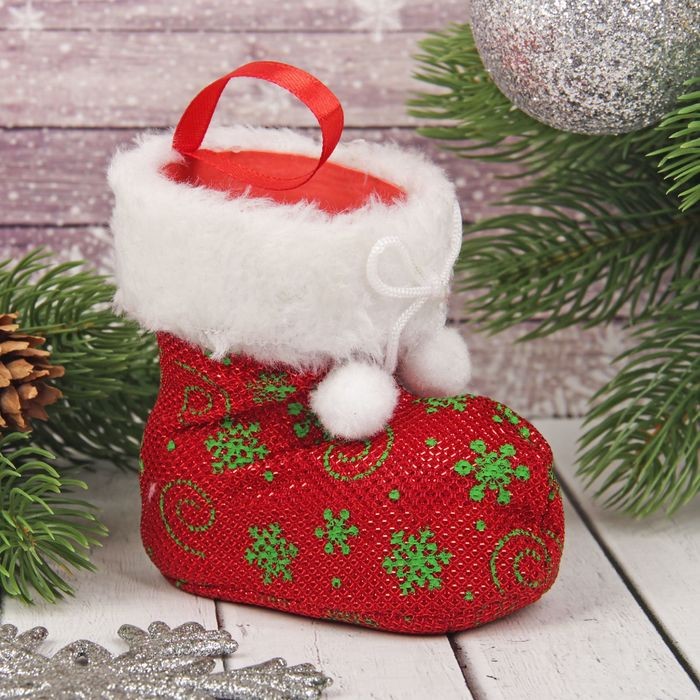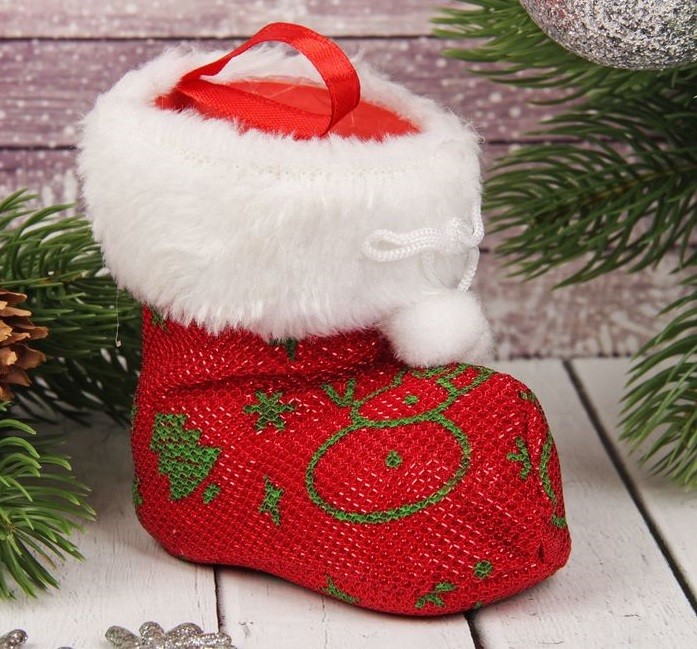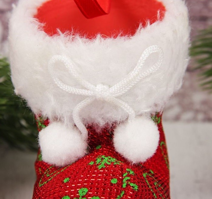 Подарочная упаковка «Сапожок», с бантиком, помпонами и белой опушкой-25%