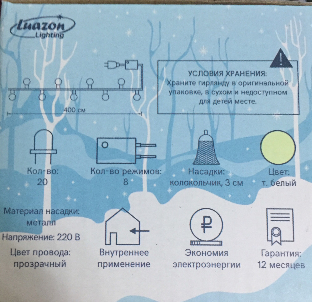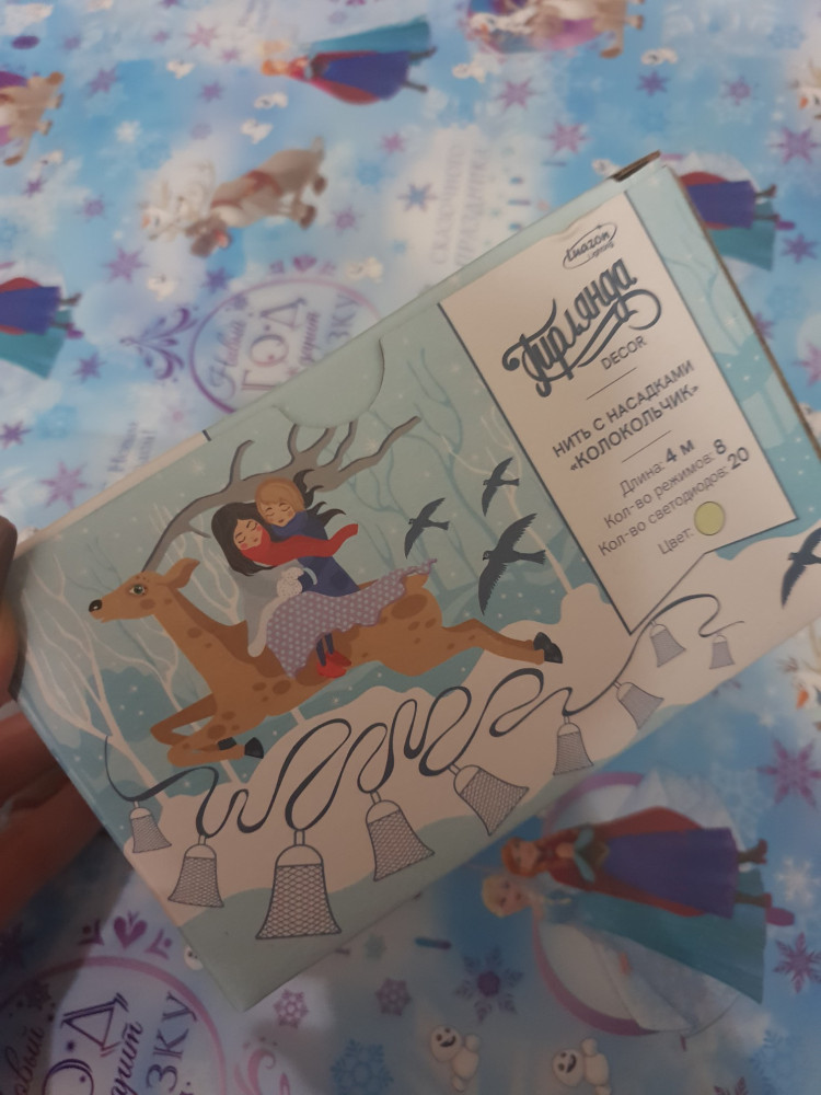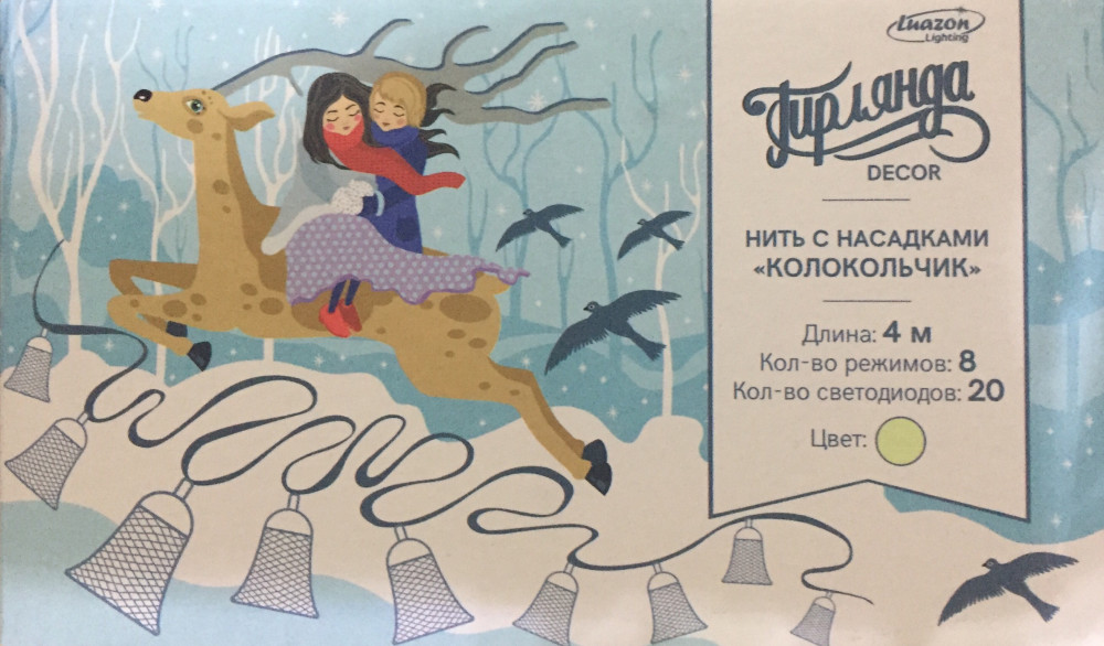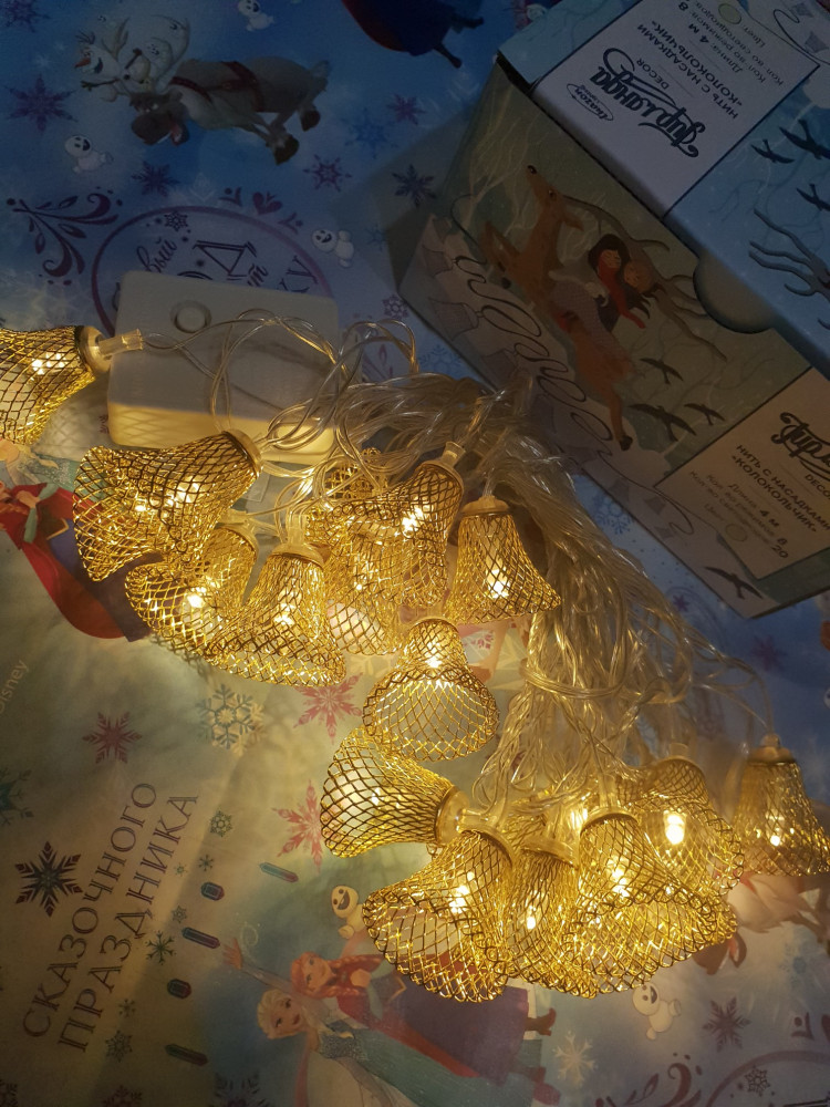 Гирлянда хорошая🌟 Но длина провода не соответствует заявленному в описании. По факту -4 метра. Колокольчики хорошие (не пластик), но небольшие. Размер не более 3 см.