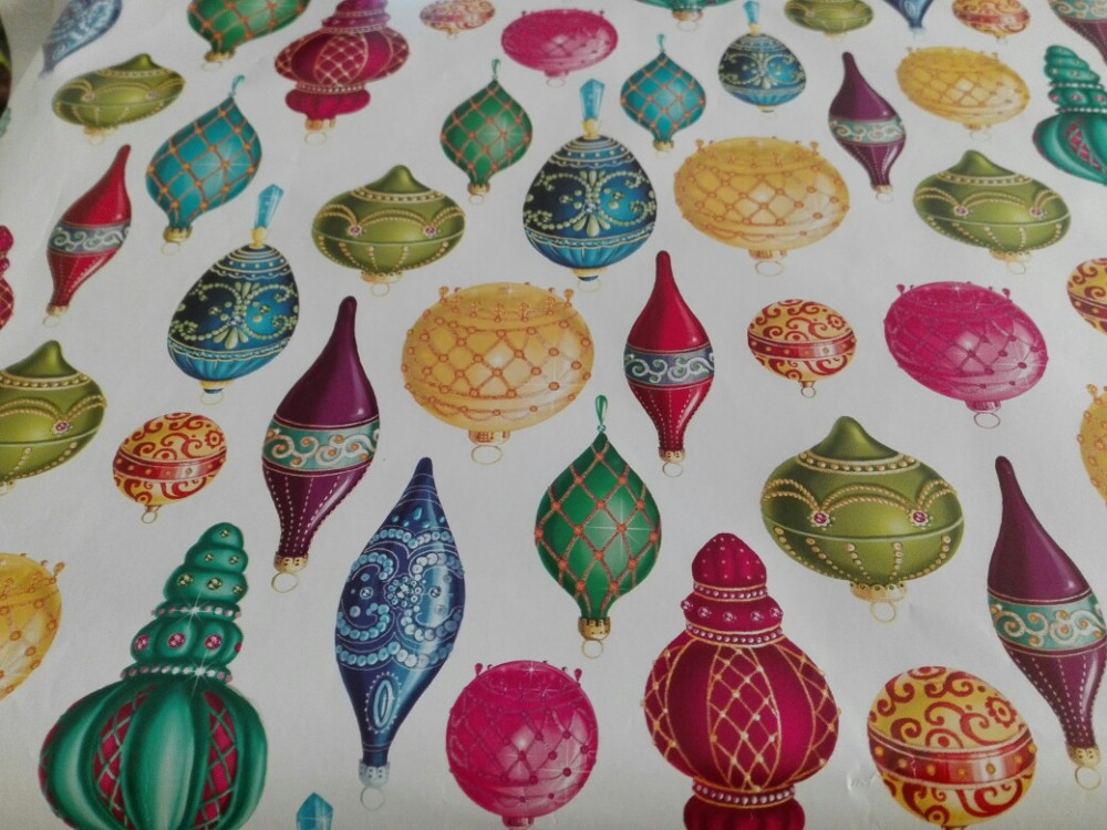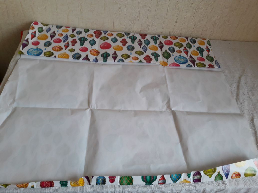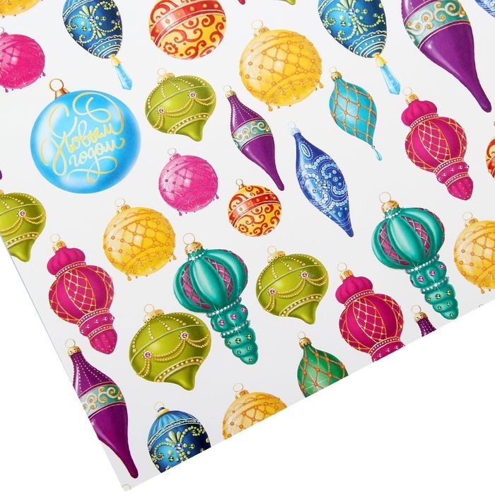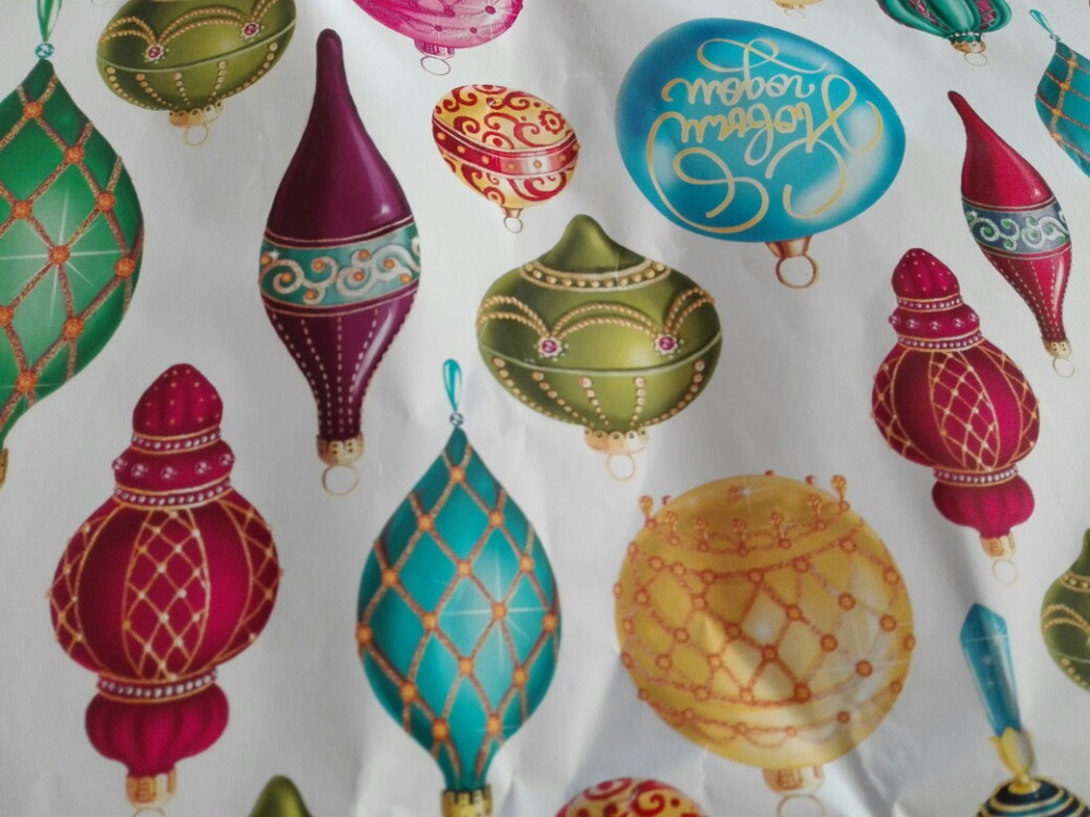 Использовала весь лист при упаковке подарков на Новый Год. Принт яркий и четкий. Качество отличное. На нарисованных игрушках есть надпись "С Новым Годом!"