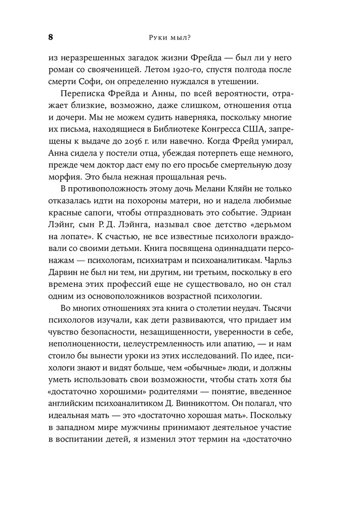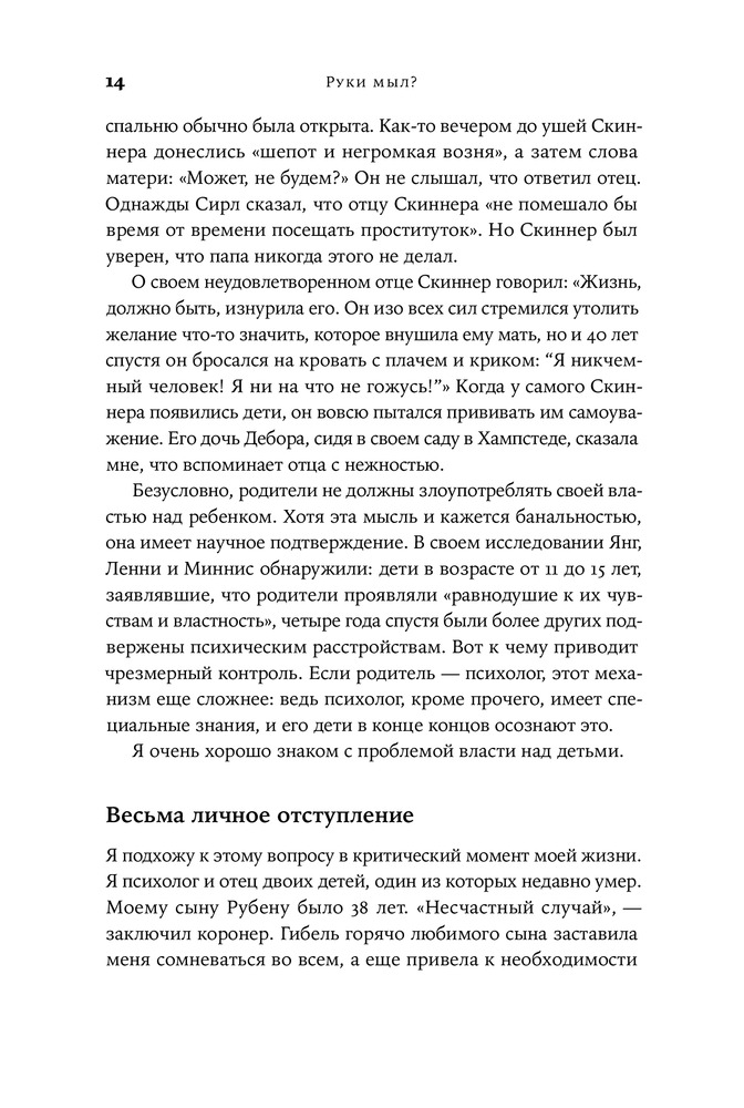 Руки мыл? Родительский опыт великих психологовВ данный момент этот товар отсутствует в продаже. Возможно, у нас найдется аналогичный или похожий товар здесь. Серия: Для родителей Безусловно, родители не должны злоупотреблять своей властью над ребенком. Хотя эта мысль и кажется банальностью, она имеет научное подтверждение. В своем исследовании Янг, Ленни и Миннис обнаружили: дети в возрасте от 11 до 15 лет, заявлявшие, что родители проявляли «равнодушие к их чувствам и властность», четыре года спустя были более других подвержены психическим расстройствам. Вот к чему приводит чрезмерный контроль. |