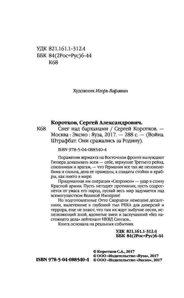 Снег над барханамиВ данный момент этот товар отсутствует в продаже. Возможно, у нас найдется аналогичный или похожий товар здесь. Серия: Война. Штрафбат. Они сражались за Родину Поражения вермахта на Восточном фронте вынуждают Гитлера доказывать всем — себе, верхушке Третьего рейха, союзникам и врагам — что Германия все так же непоколебима и сильна, дела ее праведны, а солдаты стойки и храбры как никто в мире. Придуманная им операция «Скорпион» — удар в спину Красной армии. Пусть негодует противник, пусть содрогнется от ужаса его народ, пускай весь мир задумается над всемогуществом Великой Империи! Но подготовленные Отто Скорцени немецкие десантники, вылетевшие в глубокий тыл РККА для диверсий и террора, еще не знают, что там их ждут зыбучие пески, испепеляющий зной, ядовитые змеи и заскучавший «без настоящего дела» лейтенант НКВД Синцов... Книга основана на реальных событиях. |