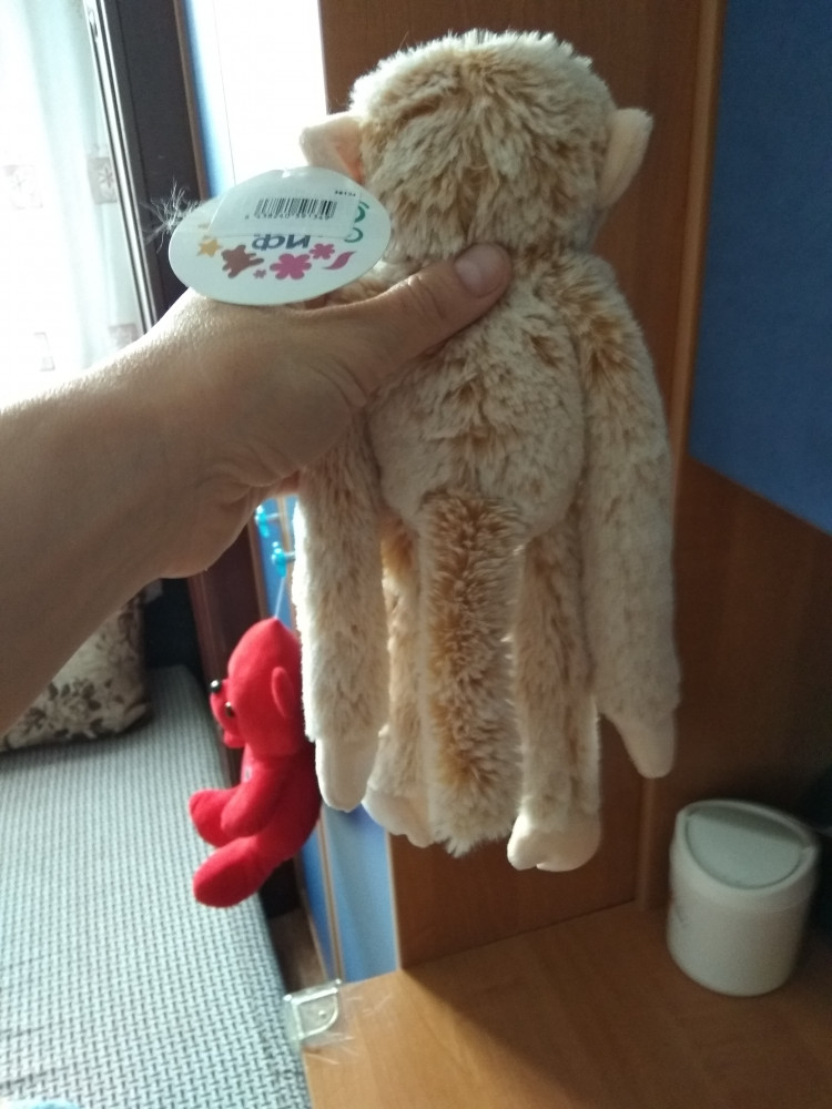 Ребенку очень понравилась мягкая обезьянка. Плюс был еще в том, что на лапах передних у нее оказалось есть липучки и легко обхватывают ребенка трех лет вокруг шеи. Дочка теперь так ее носит, как будто это настоящий зверек, который сидит на плече. Средний размер мартышки удобен детям для игры, а еще ее можно зацепить куда-либо благодаря липучкам!