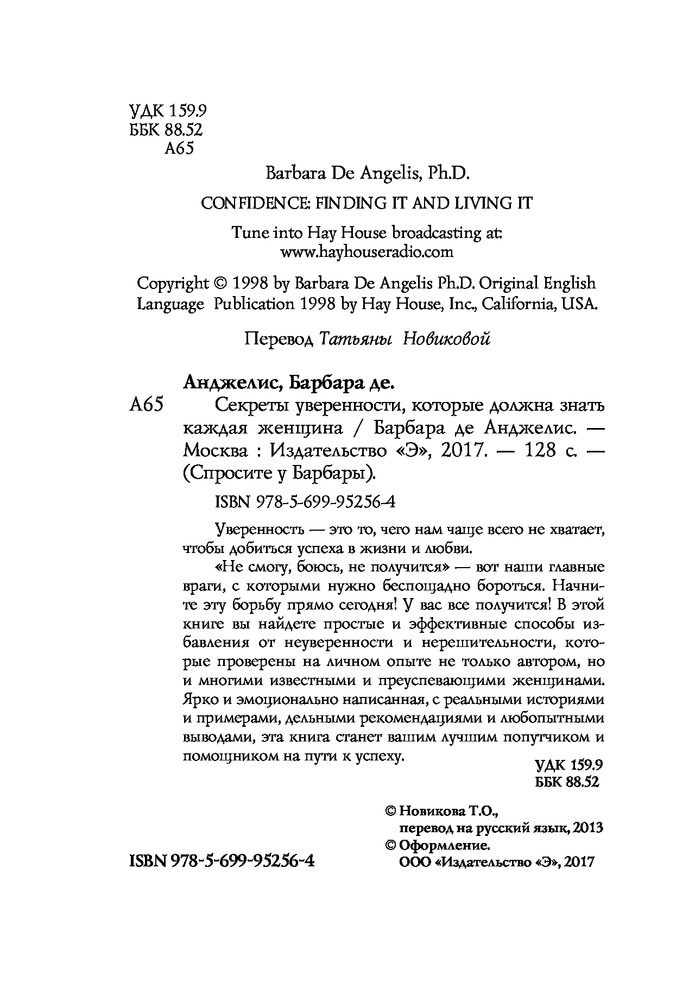 💳 Оплатить за товар можно при получении 🇰🇿 Есть бесплатная доставка по Казахстану от 1 дня 🎁 Копите бонусы с каждой покупки Серия: Спросите у Барбары Уверенность — это то, чего нам чаще всего не хватает, чтобы добиться успеха в жизни и любви. |