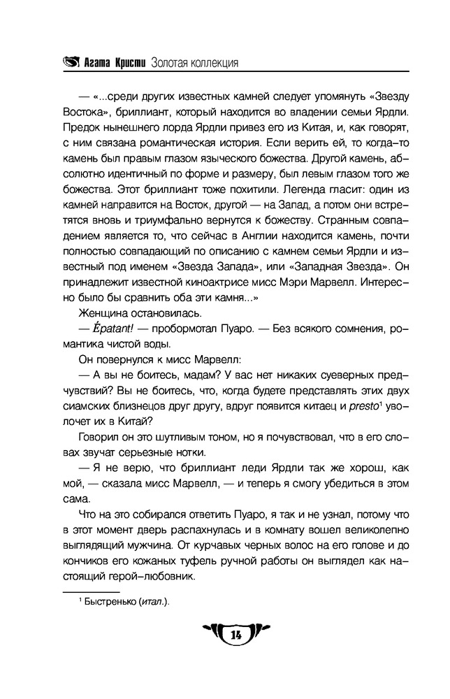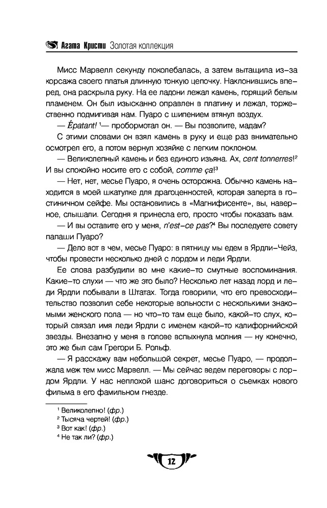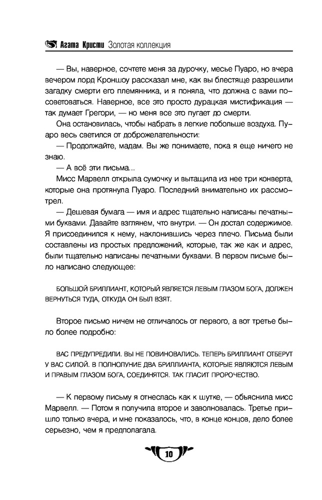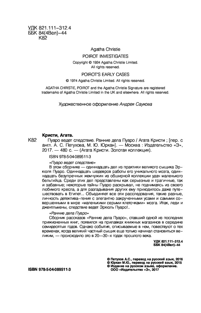 В данный момент этот товар отсутствует в продаже. Возможно, у нас найдется аналогичный или похожий товар здесь. Серия: Агата Кристи. Золотая коллекция В этом сборнике — одиннадцать дел из практики великого сыщика Эркюля Пуаро. Одиннадцать шедевров работы его уникального мозга, одиннадцать безупречных жемчужин из обширной коллекции удач маленького бельгийца. Среди этих дел представлены как серьезные и трагичные, так и забавные; некоторые тайны Пуаро раскрывал, не поднимаясь из своего любимого кресла, а для разгадывания других ему приходилось даже путешествовать в Египет. Объединяет все эти расследования, такие разные, личность детектива-гения с элегантно закрученными усами и самыми совершенными в мире «маленькими серыми клеточками» мозга. Итак, леди и джентльмены, следствие ведет Эркюль Пуаро!