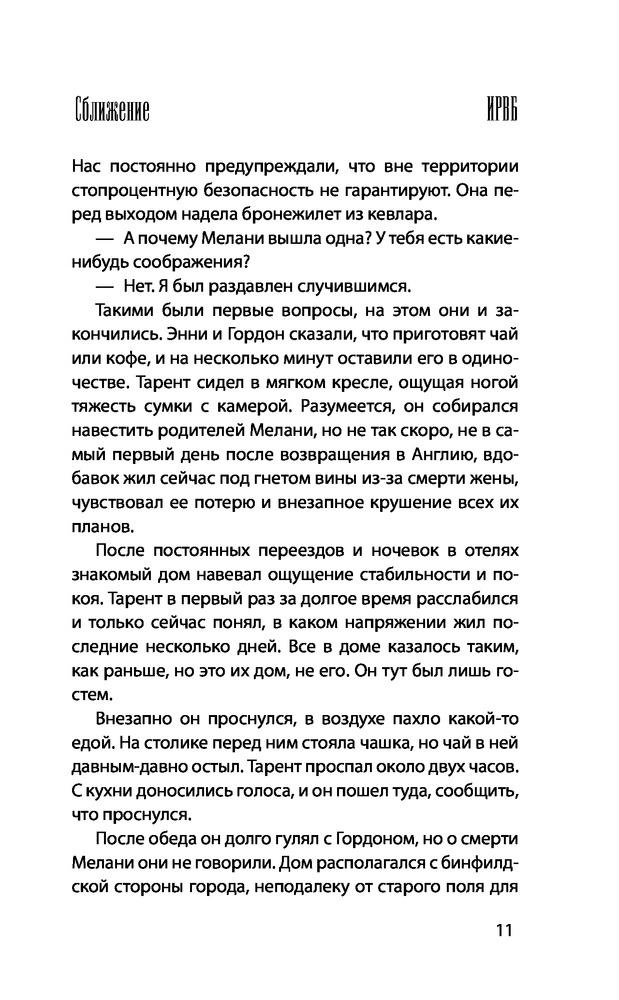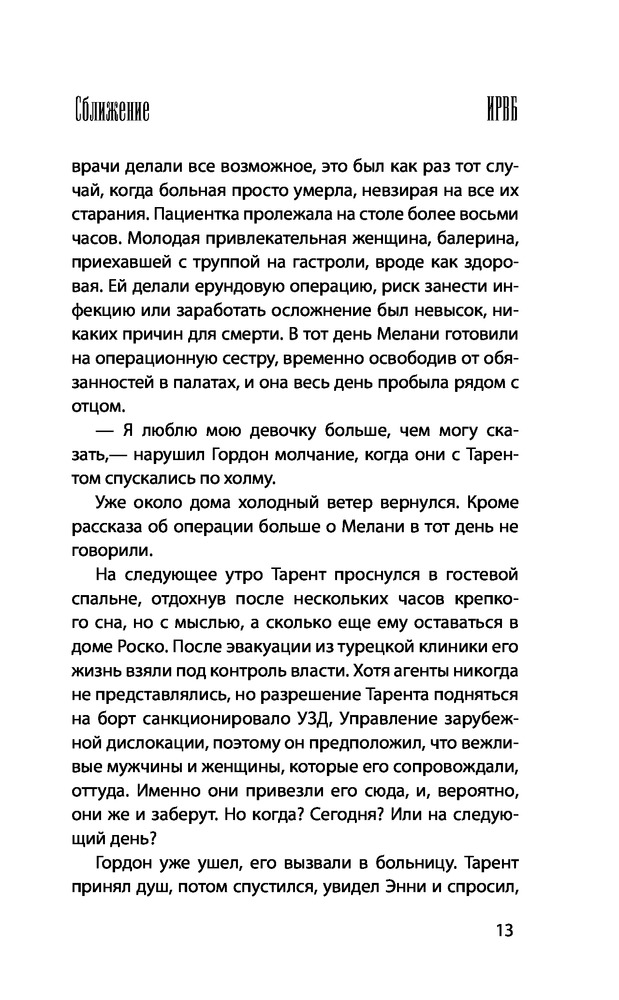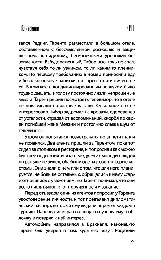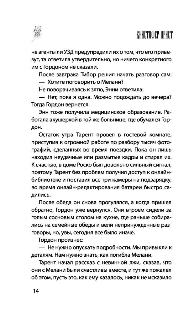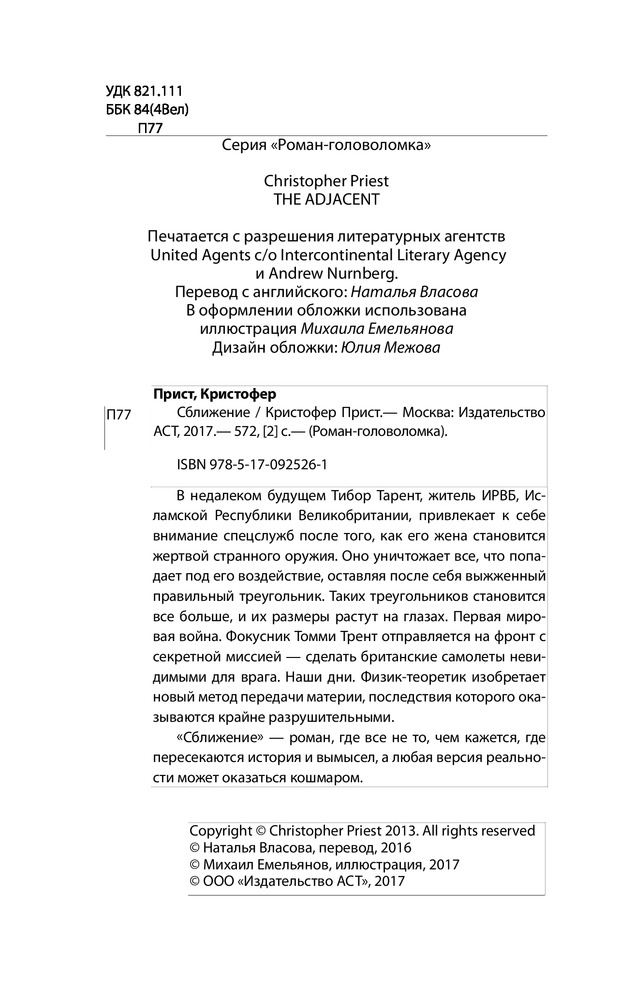 В данный момент этот товар отсутствует в продаже. Возможно, у нас найдется аналогичный или похожий товар здесь. Серия: Роман-головоломка В недалеком будущем Тибор Тарент, житель ИРВБ, Исламской Республики Великобритании, привлекает к себе внимание спецслужб после того, как его жена становится жертвой странного оружия. Оно уничтожает все, что попадает под его воздействие, оставляя после себя выжженный правильный треугольник. Таких треугольников становится все больше, и их размеры растут на глазах. Первая мировая война. Фокусник Томми Трент отправляется на фронт с секретной миссией — сделать британские самолеты невидимыми для врага. Наши дни. Физик-теоретик изобретает новый метод передачи материи, последствия которого оказываются крайне разрушительными. «Сближение» — роман, где все не то, чем кажется, где пересекаются история и вымысел, а любая версия реальности может оказаться кошмаром. |