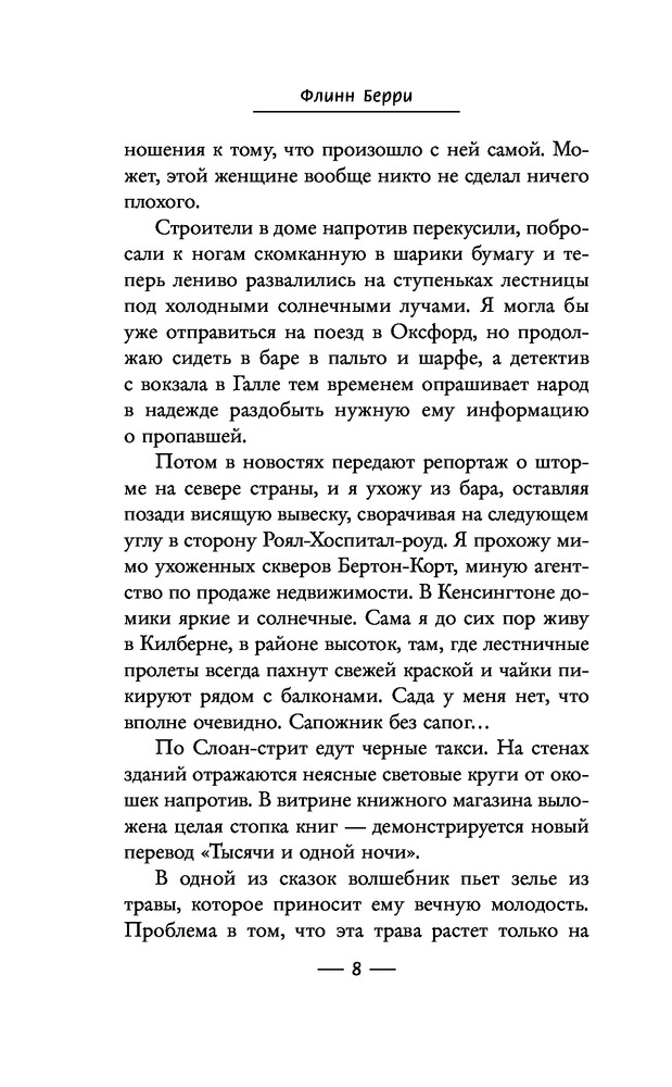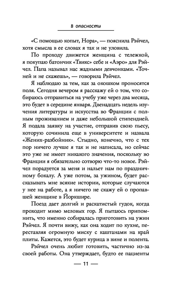 Сверхзанудная книга!. Полицейского расследования нет, «расследования» героини тоже нет. Будете читать как проходит день Норы. Проснулась, поела(меню), пошла в дом сестры, пошла доводить до белого каления водопроводчика, вернулась в гостиницу, поела(меню) , сходила в туалет… и все это перемежается хаотичными воспоминаниями об одном и том же. После 120 стр просто листала до конца. А вдруг интересно. Не случилось…