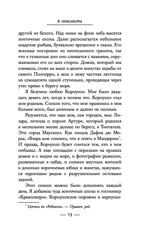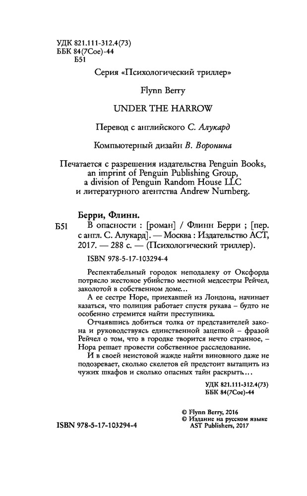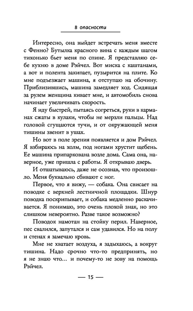 В опасностиВ данный момент этот товар отсутствует в продаже. Возможно, у нас найдется аналогичный или похожий товар здесь. Серия: Психологический триллер Нора Лоренс приезжает навестить свою сестру Рэйчел в небольшой тихий городок Марлоу, расположенный недалеко от Оксфорда. Но вместо теплой встречи и семейного ужина её ждут следы крови на лестнице и тело Рэйчел на втором этаже... |