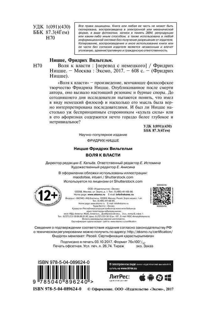 Воля к властиВ данный момент этот товар отсутствует в продаже. Возможно, у нас найдется аналогичный или похожий товар здесь. Серия: Фридрих Ницше (обложка) «Воля к власти» — произведение, венчающее философское творчество Фридриха Ницше. Опубликованное после смерти автора, оно вызвало настоящий резонанс и бурные споры. До сегодняшнего дня исследователи пытаются понять, что имел в виду немецкий философ и насколько его мысль была верно интерпретирована последователями. И был ли Ницше настолько уж беспринципным сторонником «культа силы» или в его афоризмах содержится нечто гораздо более глубокое и нетривиальное? |