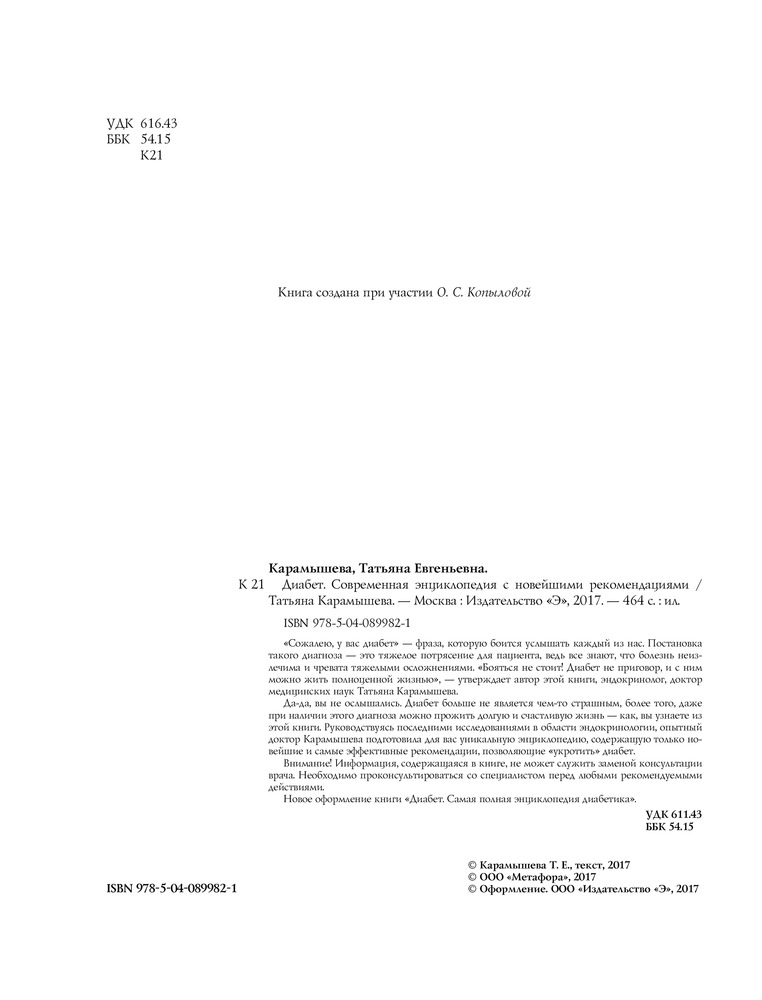 Диабет. Современная энциклопедия с новейшими рекомендациямиВ данный момент этот товар отсутствует в продаже. Возможно, у нас найдется аналогичный или похожий товар здесь. Серия: Книги-консультанты по вашему здоровью «Сожалею, у вас диабет» — фраза, которую боится услышать каждый из нас. Постановка такого диагноза — это тяжелое потрясение для пациента, ведь все знают, что болезнь неизлечима и чревата тяжелыми осложнениями. «Бояться не стоит! Диабет не приговор, и с ним можно жить полноценной жизнью» — утверждает автор этой книги, эндокринолог, доктор медицинских наук Татьяна Карамышева. |