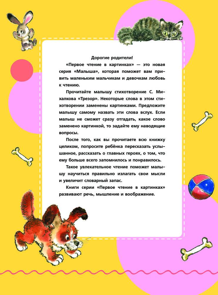 В данный момент этот товар отсутствует в продаже. Возможно, у нас найдется аналогичный или похожий товар здесь. Серия: Первое чтение в картинках Прочитайте малышу знаменитое стихотворение С.В. Михалкова «Трезор» и попросите его назвать вслух те слова, которые заменены картинками. Детки с удовольствием послушают про непоседливого щенка, рассмотрят большие картинки, а заодно увеличат свой словарный запас, смогут научиться правильно излагать свои мысли и потренируют своё воображение! |