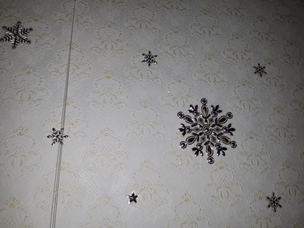 Наклейки в форме снежинок красивые. Цвет золотисто - серебристый. Размеры разные. Приклеили на стену на обои. Клеятся легко. Смотрятся по новогоднему красиво. На счет того, что многоразового использования узнаем позже, когда снимем после Рождества.Спасибо flip.