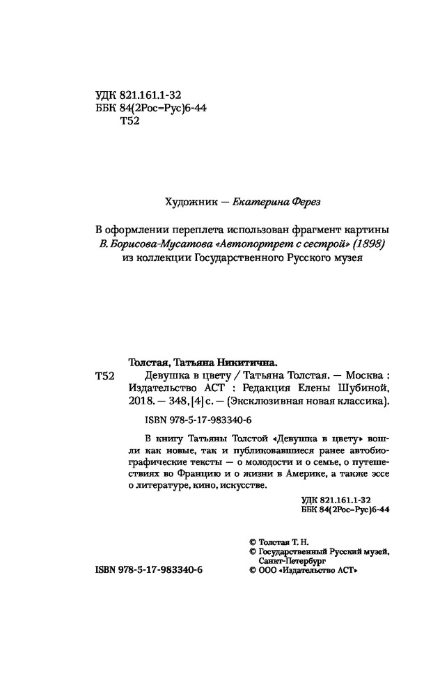 Девушка в цветуВ данный момент этот товар отсутствует в продаже. Возможно, у нас найдется аналогичный или похожий товар здесь. Серия: Эксклюзивная новая классика В новую книгу Татьяны Толстой «Девушка в цвету» вошли как новые, так и публиковавшиеся ранее автобиографические тексты — о молодости и о семье, о путешествиях во Францию и жизни в Америке, а также эссе о литературе, кино, искусстве |