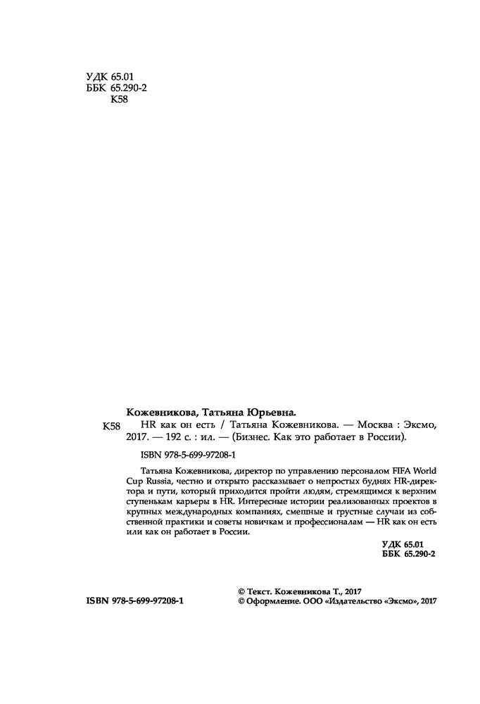 HR как он естьВ данный момент этот товар отсутствует в продаже. Возможно, у нас найдется аналогичный или похожий товар здесь. Серия: Бизнес. Как это работает в России Татьяна Кожевникова, директор по управлению персоналом FIFA World Сup Russia, честно и открыто рассказывает о непростых буднях HR-директора и пути, который приходится пройти людям, стремящимся к верхним ступенькам карьеры в HR. Интересные истории реализованных проектов в крупных международных компаниях, смешные и грустные случаи из собственной практики и советы новичкам и профессионалам — HR как он есть или как он работает в России. |
