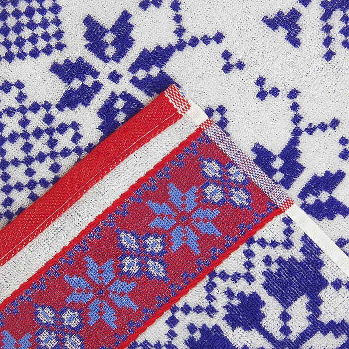 Фон полотенца не белый, каким кажется на картинке, а грязновато-голубой. С обратной стороны оно темно-синее с белым рисунком, довольно тонкое, надолго не хватит. У красного из этой серии фон тоже блекло-розовый.