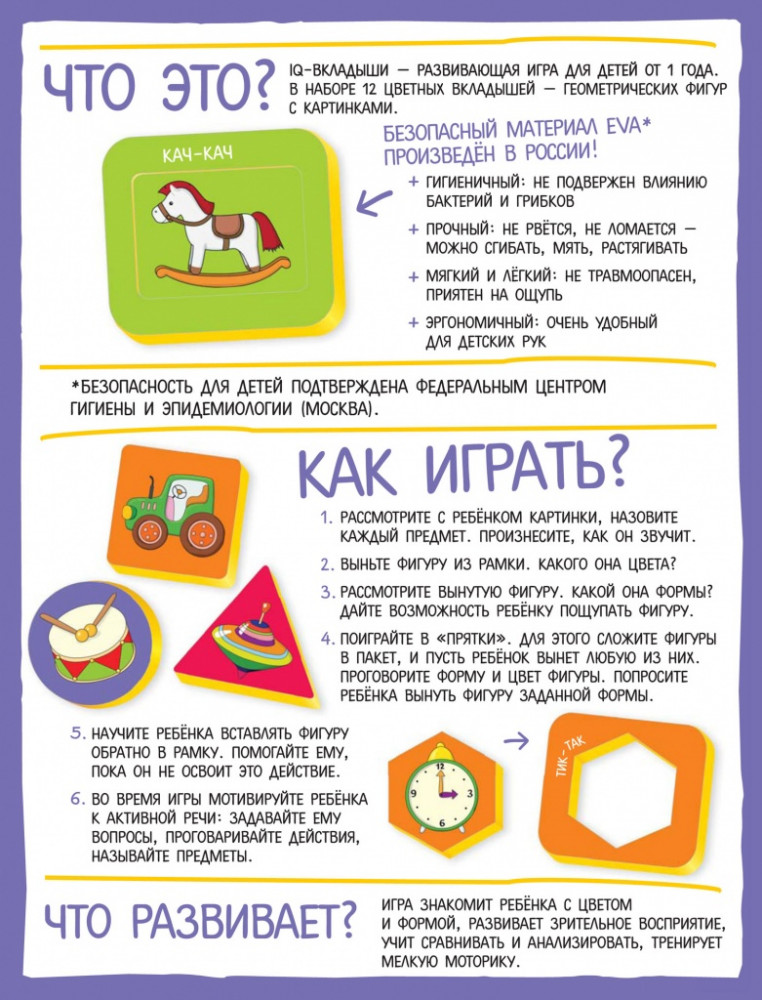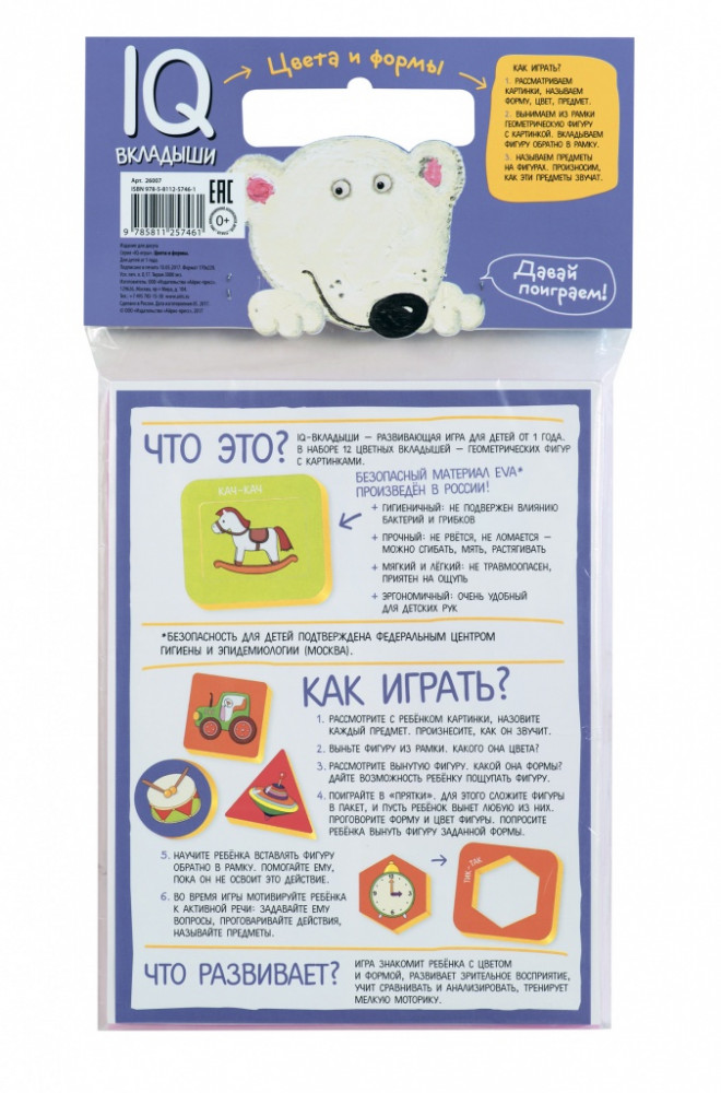 💳 Оплатить за товар можно при получении 🇰🇿 Есть бесплатная доставка по Казахстану от 1 дня 🎁 Копите бонусы с каждой покупки IQ-Вкладыши "Цвета и формы" - это увлекательная настольная игра, которая поможет познакомить ребёнка с геометрическими фигурами, развить его восприятие и мелкую моторику. Малыш научится координировать движения руки и пальцев, а это напрямую влияет на развитие интеллекта. |