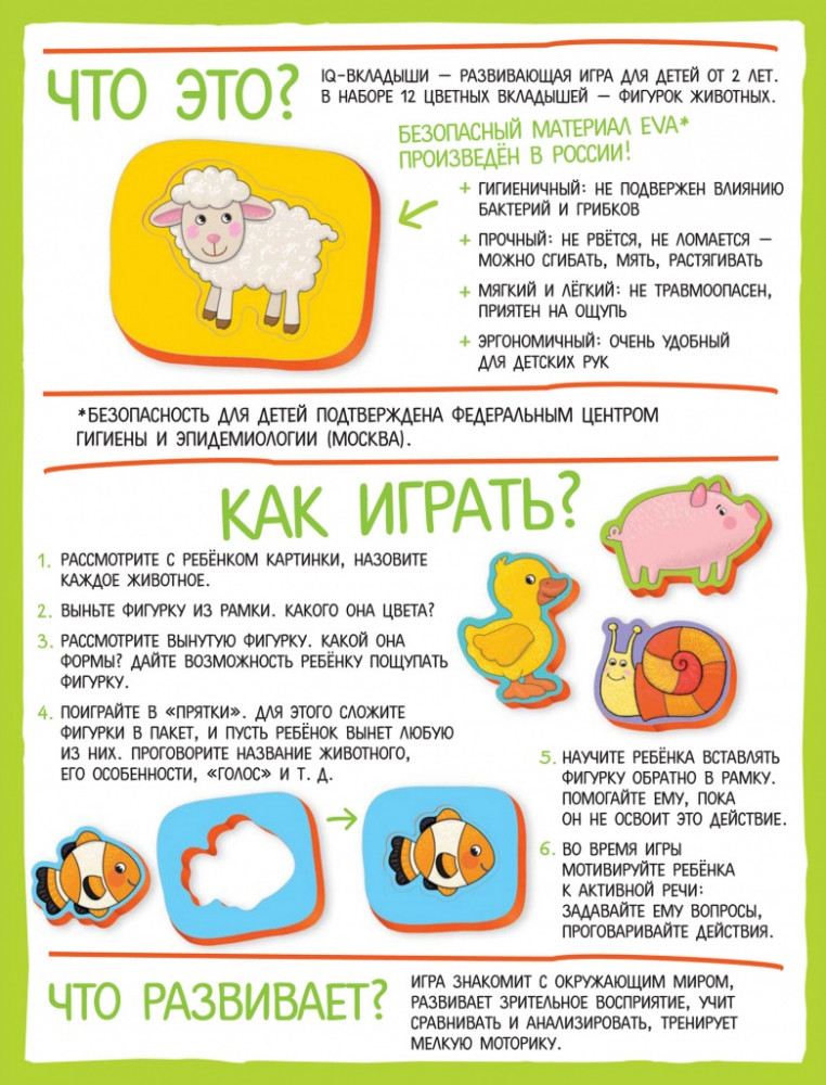 Мягкие игры. Вкладыши. ЗверушкиВ данный момент этот товар отсутствует в продаже. Возможно, у нас найдется аналогичный или похожий товар здесь. Серия: IQ игры IQ-Вкладыши «Зверушки» — это увлекательная настольная игра, которая познакомит ребёнка с животными. Она тренирует мелкую моторику, логическое мышление, восприятие и память, развивает умение сравнивать и группировать. IQ-Вкладыши помогут малышу научиться координировать движения руки и пальцев, а это напрямую влияет на развитие интеллекта. |