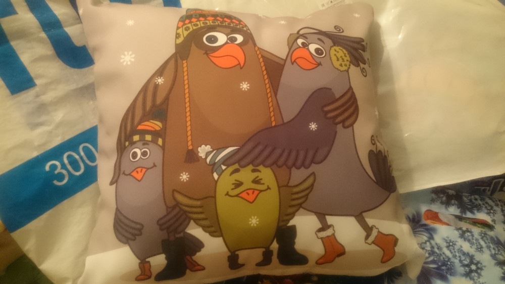 Хорошая, качественная подушечка, с семейно-зимним мотивом. Хороша и для дома и для подарка.