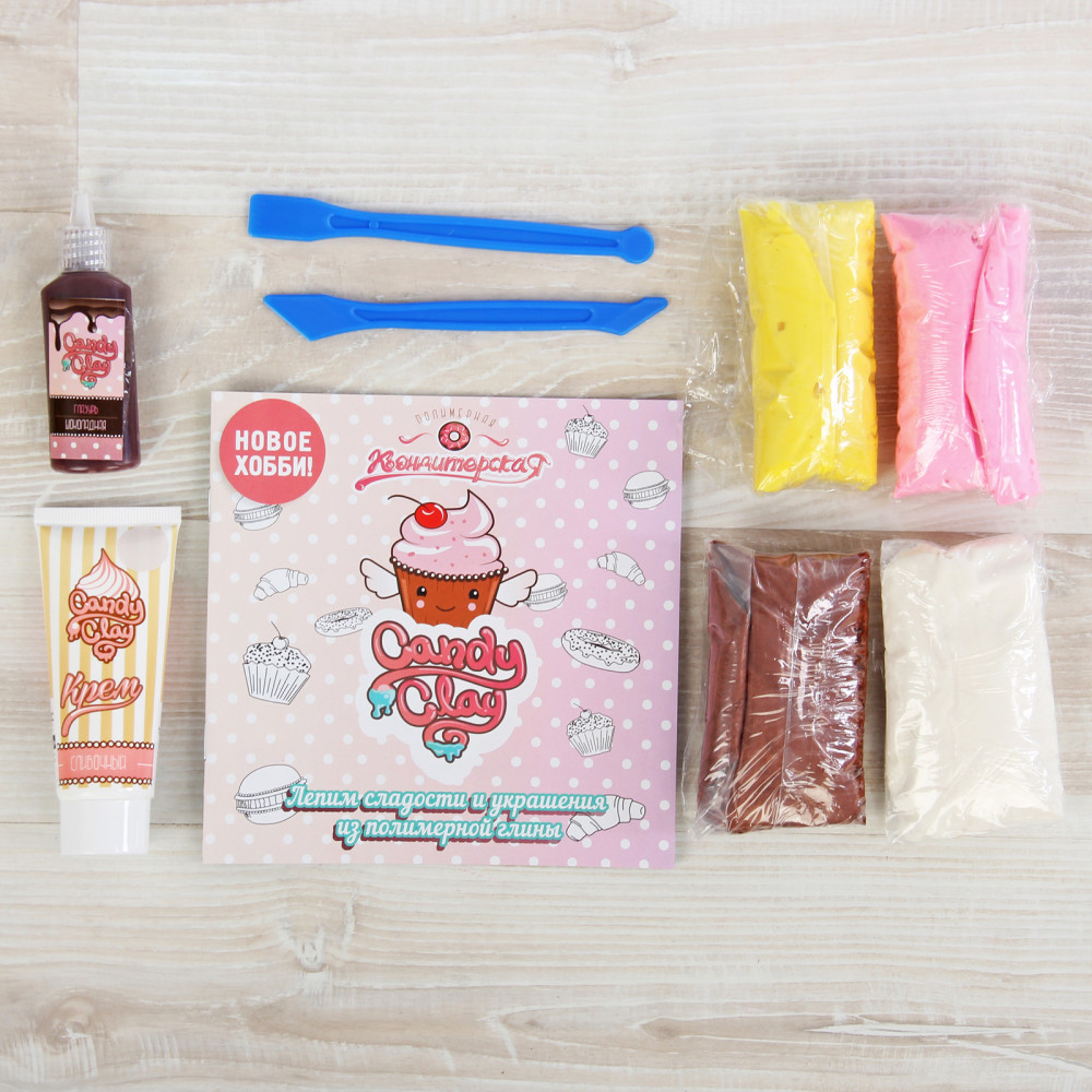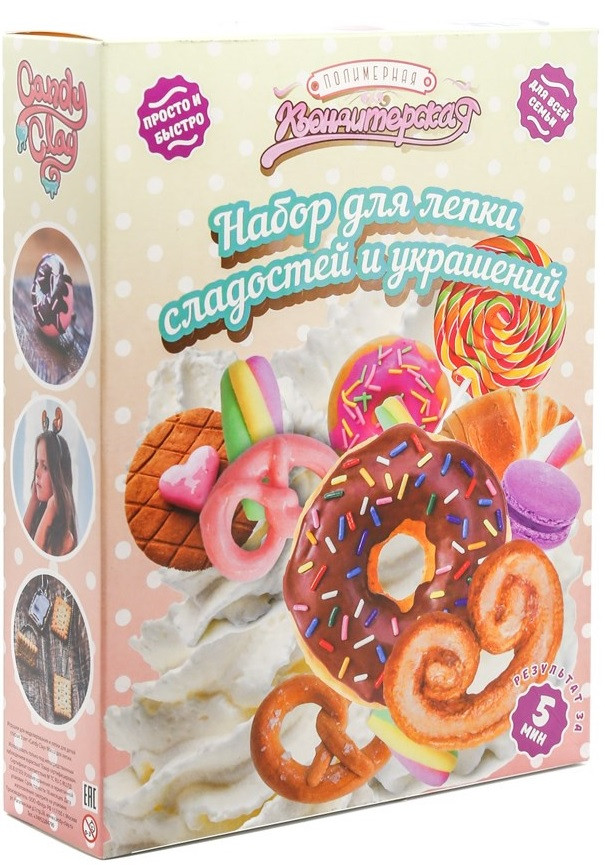Набор для лепки из полимерной кондитерской глины «Для лепки сладостей и украшений» предназначен для декоративно-прикладного творчества и занятий с детьми от 3-х лет. В наборе 3 вида массы: глина 5 цветов (каждая по 25 г.), глазурь 1 цвет и крем 1 цвет.