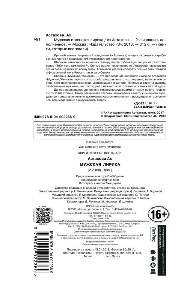 Мужская и женская лирикаТатьяна Григорьевна Кальницкая, Ах Астахова В данный момент этот товар отсутствует в продаже. Возможно, у нас найдется аналогичный или похожий товар здесь. Серия: Книги, которые все ждали Ирина Астахова (творческий псевдоним Ах Астахова) — один из самых востребованных поэтов в современном русскоязычном пространстве. |