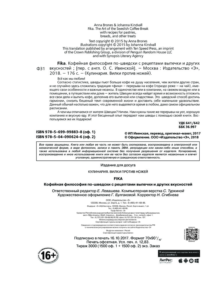 В книге много графичных рисунков, обозначающих ингредиенты в действии. А также много рисунков, раскрывающих атмосферу перерывов на кофе. Рецепты очень просты по продуктам и исполнению. Атмосфера книги очень уютна, как беседа с близкими друзьями. От булочек с корицей (стр. 32) до кекса с кардамоном (стр. 36), здесь вы найдете самые известные и традиционные шведские рецепты для fika, включая несколько наших любимых рецептов печенья, которые мы чуть-чуть доработали, чтобы сделать поистине великолепными. |